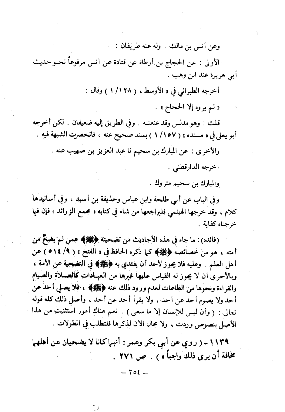(1139) - (روى عن أبى بكر وعمر: " أنهما كانا لا يضحيان عن أهلهما مخافة أن يرى ذلك واجبا " (ص 271) .
