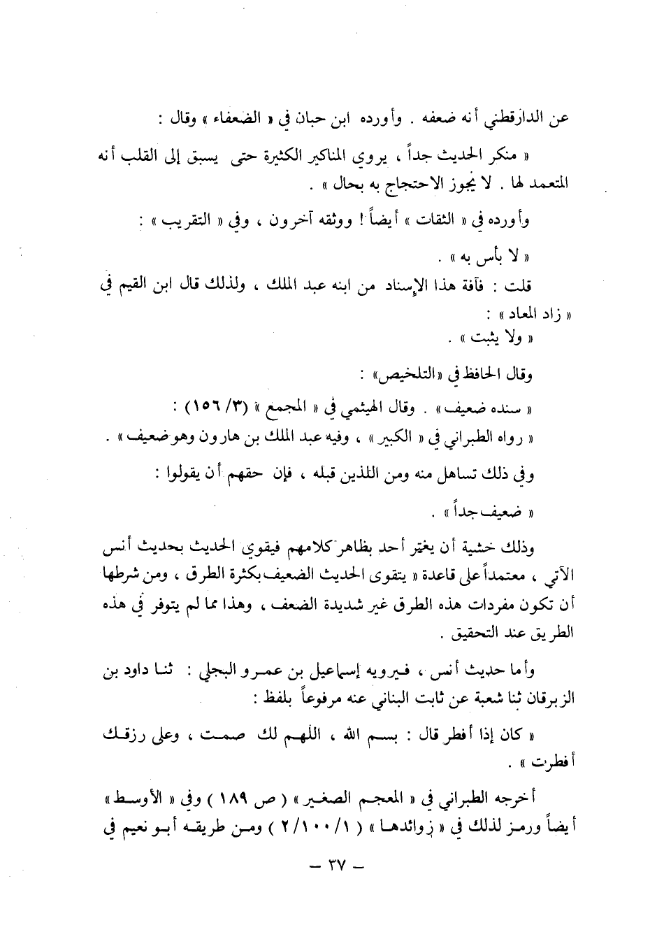 وأما حديث أنس , فيرويه إسماعيل بن عمرو البجلى: حدثنا داود بن الزبرقان حدثنا شعبة عن ثابت البنانى عنه مرفوعا بلفظ: " كان إذا أفطر قال: بسم الله , اللهم لك صمت , وعلى رزقك أفطرت ".