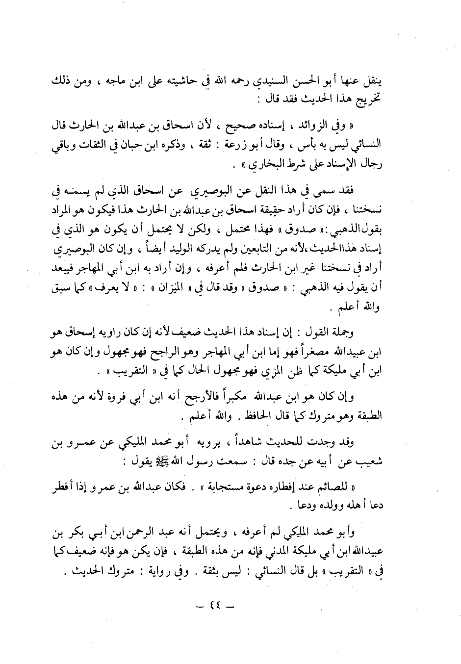 ينقل عنها أبو الحسن السنيدي [1] رحمه الله فى حاشيته على ابن ماجه , ومن ذلك تخريج هذا الحديث فقد قال: " وفى الزوائد , إسناده صحيح , لأن إسحاق بن عبد الله بن الحارث قال النسائى ليس به بأس , وقال أبو زرعة: ثقة , وذكره ابن حبان فى " الثقات " وباقى رجال الإسناد على شرط البخارى ".