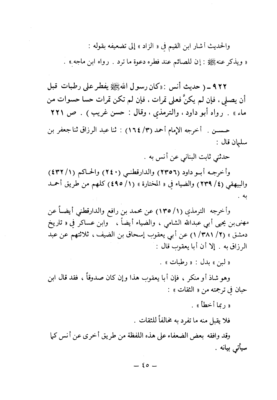 (922) - (حديث أنس: " كان رسول الله صلى الله عليه وسلم يفطر على رطبات قبل أن يصلى , فإن لم يكن فعلى تمرات , فإن لم تكن تمرات حسا حسوات من ماء ". رواه أبو داود , والترمذى , وقال: حسن غريب (ص 221) .