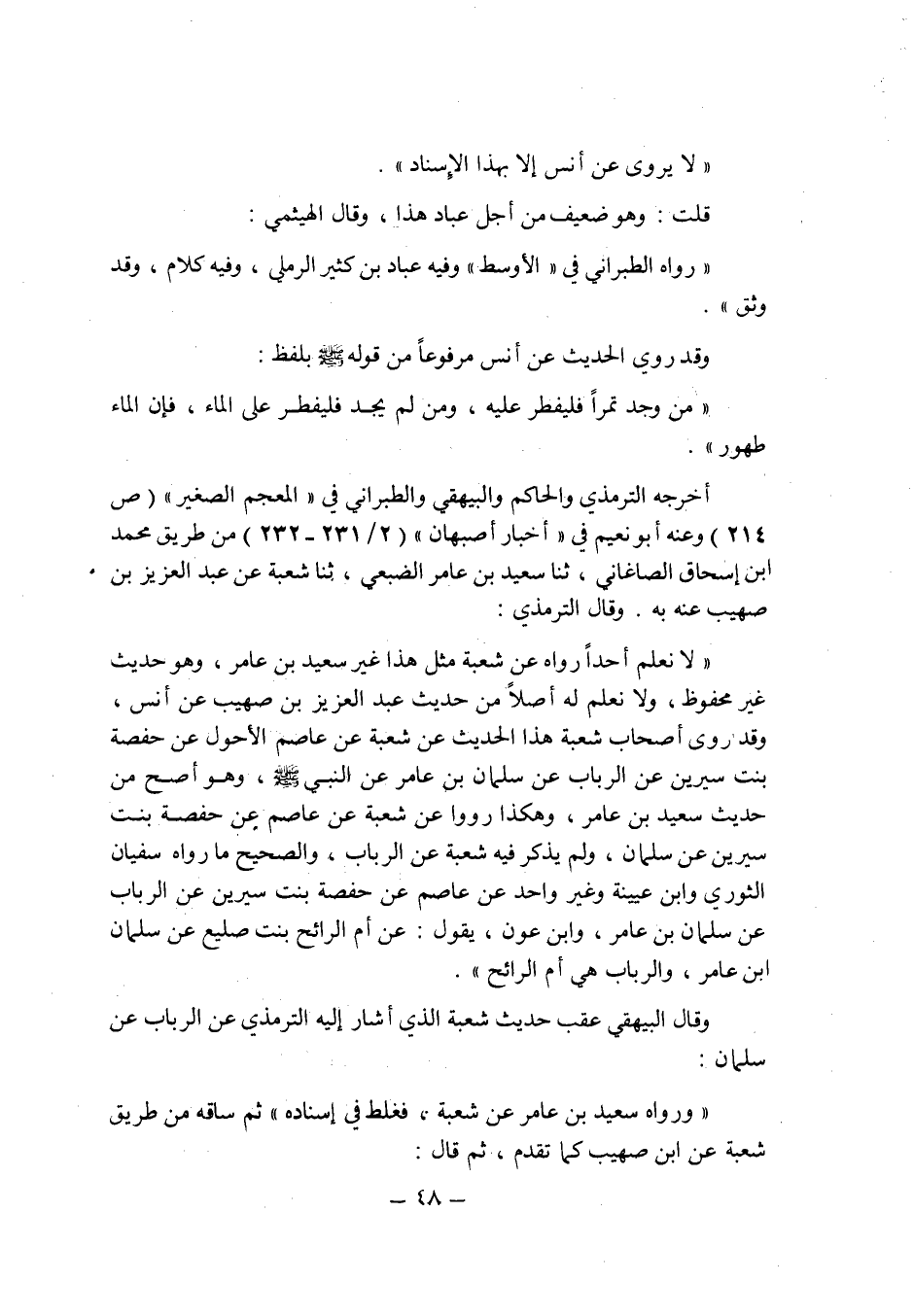 وقال البيهقى عقب حديث شعبة الذى أشار إليه الترمذى عن الرباب عن سلمان: " ورواه سعيد بن عامر عن شعبة , فغلط فى إسناده " ثم ساقه من طريق شعبة عن ابن صهيب كما تقدم , ثم قال: