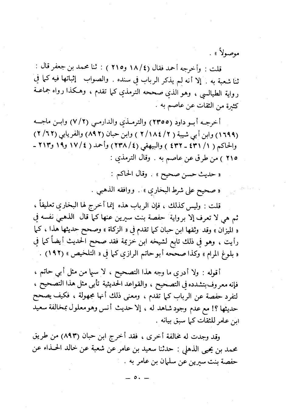 أقوله: ولا أدرى ما وجه هذا التصحيح , لا سيما من مثل أبى حاتم , فإنه معروف بتشدده فى التصحيح , والقواعد الحديثية تأبى مثل هذا التصحيح , لتفرد حفصة عن الرباب كما تقدم , ومعنى ذلك أنها مجهولة , فكيف يصحح حديثها؟ ! مع عدم وجود شاهد له , إلا حديث أنس وهو معلول بمخالفة سعيد بن عامر للثقات كما سبق بيانه.