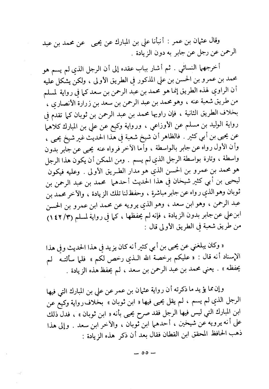ومن الممكن أن يكون هذا الرجل هو محمد بن عمرو بن الحسن الذى هو مدار الطريق الأولى. وعليه فيكون ليحيى بن أبى كثير شيخان فى هذا الحديث أحدهما محمد بن عبد الرحمن بن ثوبان وهو الذى رواه عن جابر مباشرة , وحفظ لنا تلك الزيادة , والآخر محمد بن عبد الرحمن , وهو ابن سعد , وهو الذى يرويه عن محمد بن عمرو بن الحسن بن على عن جابر بدون الزيادة , فإنه لم