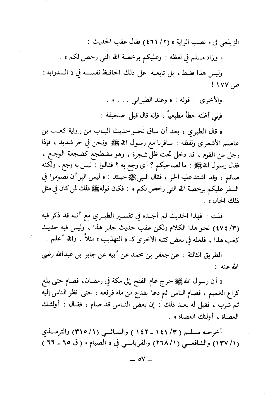الطريق الثالثة: عن جعفر بن محمد عن أبيه عن جابر بن عبد الله رضى الله عنه: " أن رسول الله صلى الله عليه وسلم خرج عام الفتح إلى مكة فى رمضان , فصام حتى بلغ كراع الغميم , فصام الناس ثم دعا بقدح من ماء فرفعه , حتى نظر الناس إليه ثم شرب , فقيل له بعد ذلك: إن بعض الناس قد صام , فقال: أولئك العصاة , أولئك العصاة ".