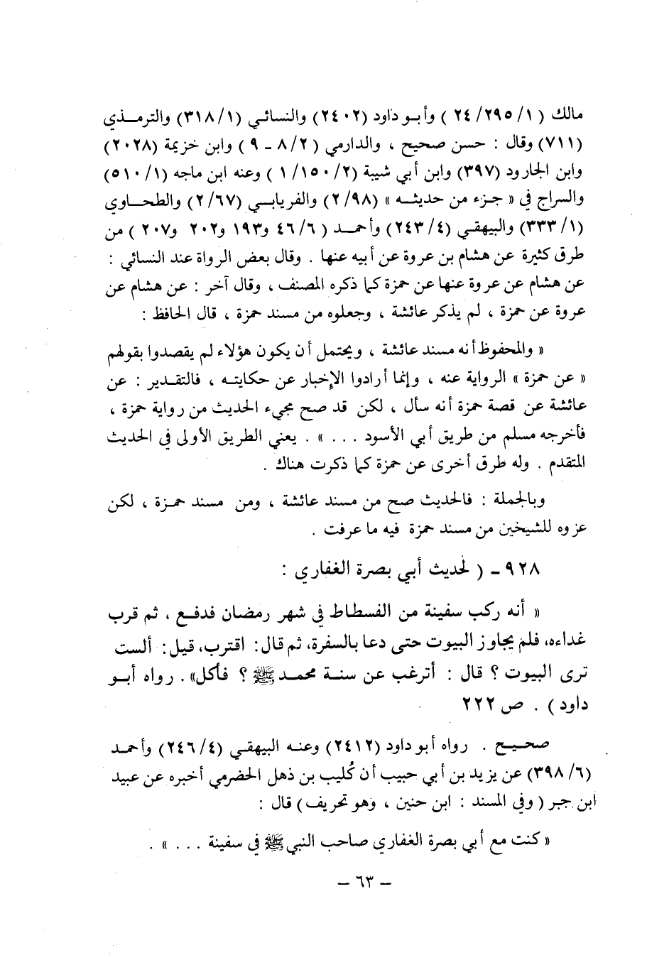 (928) - (لحديث أبى بصرة الغفارى: " أنه ركب سفينة من الفسطاط فى شهر رمضان فدفع , ثم قرب غداءه , فلم يجاوز البيوت حتى دعا بالسفرة , ثم قال: اقترب , قيل: ألست ترى البيوت؟ قال: أترغب عن سنة محمد صلى الله عليه وسلم؟ فأكل ". رواه أبو داود (ص 222) .