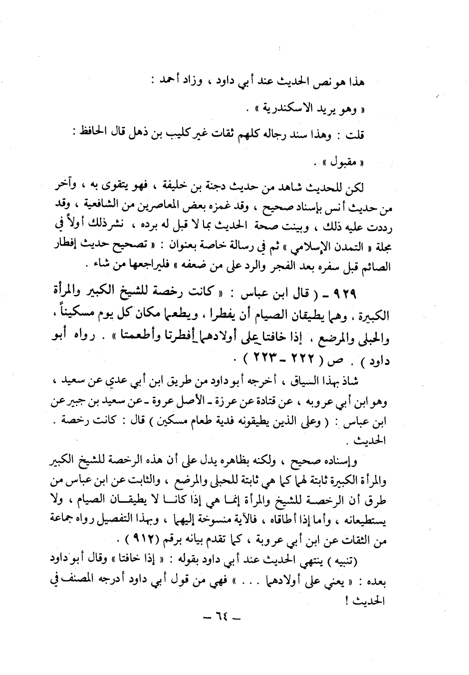 (929) - (قال ابن عباس: " كانت رخصة للشيخ الكبير والمرأة الكبيرة , وهما يطيقان الصيام أن يفطرا , ويطعما مكان كل يوم مسكيناً , والحبلى والمرضع , إذا خافتا على أولادهما أفطرتا وأطعمتا " رواه أبو داود (ص 222 ـ 223) .