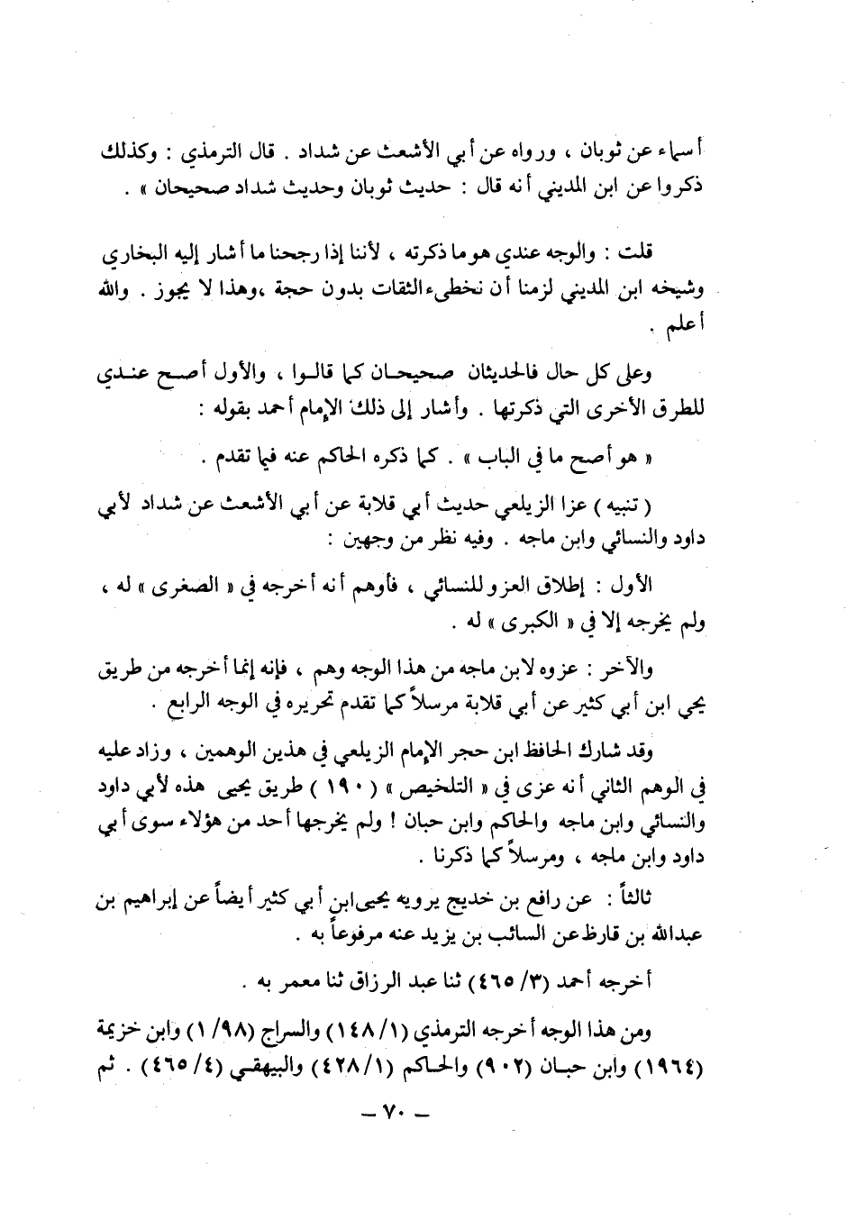أسماء عن ثوبان , ورواه عن أبى الأشعث عن شداد. قال الترمذى: وكذلك ذكروا عن ابن المدينى أنه قال: حديث ثوبان وحديث شداد صحيحان ".