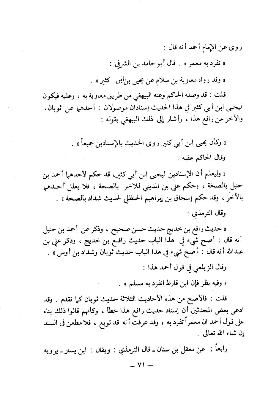 وقد ادعى بعض المحدثين أن إسناد حديث رافع هذا خطأ , وكأنهم قالوا ذلك بناء على قول أحمد أن معمرا تفرد به , وقد عرفت أنه قد توبع , فلا مطعن فى السند إن شاء الله تعالى.