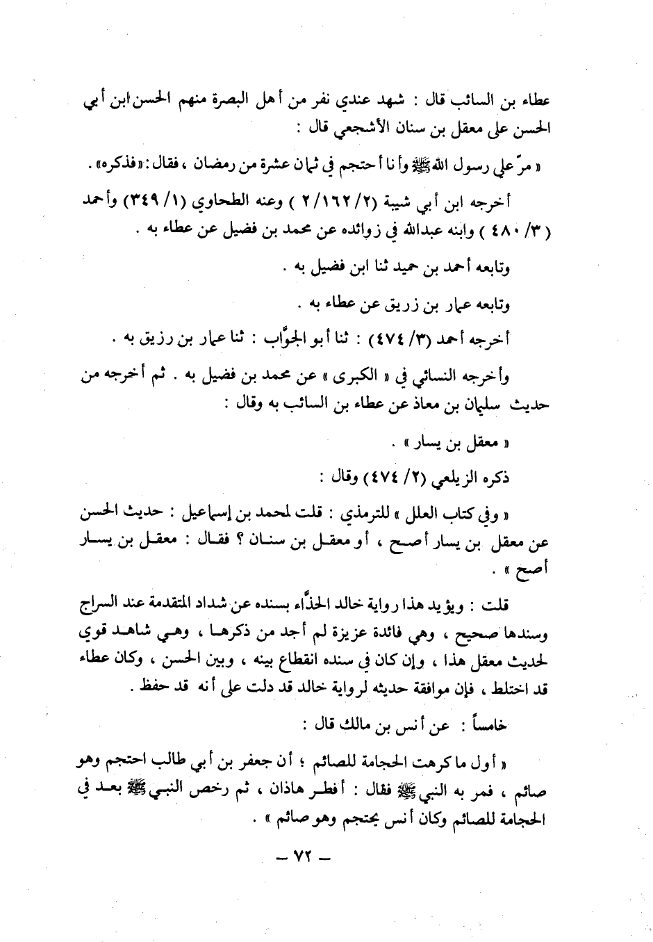 خامسا: عن أنس بن مالك قال: " أول ما كرهت الحجامة للصائم ; أن جعفر بن أبى طالب احتجم وهو صائم , فمر به النبى صلى الله عليه وسلم فقال: أفطر هذان , ثم رخص النبى صلى الله عليه وسلم بعد فى الحجامة للصائم وكان أنس يحتجم وهو صائم ".