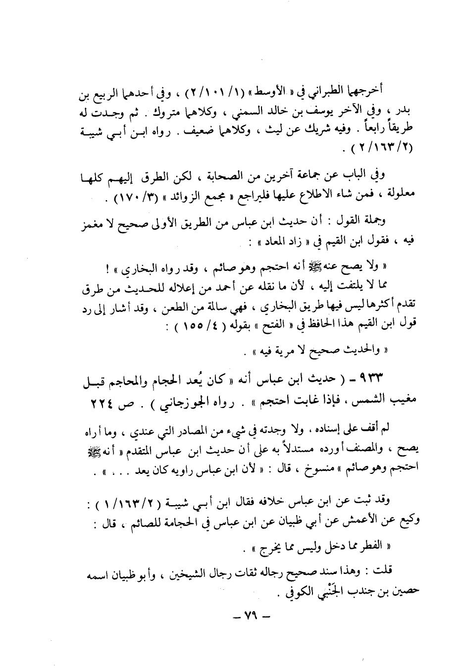 وجملة القول: أن حديث ابن عباس من الطريق الأولى صحيح لا مغمز فيه , فقول ابن القيم فى " زاد المعاد ": " ولا يصح عنه صلى الله عليه وسلم أنه احتجم وهو صائم , وقد رواه البخارى "! مما لا يلتفت إليه , لأن ما نقله عن أحمد من إعلاله للحديث من طرق تقدم أكثرها ليس فيها طريق البخارى , فهى سالمة من الطعن , وقد أشار إلى رد قول ابن القيم هذا الحافظ فى " الفتح " بقوله (4/155) : " والحديث صحيح لا مرية فيه".