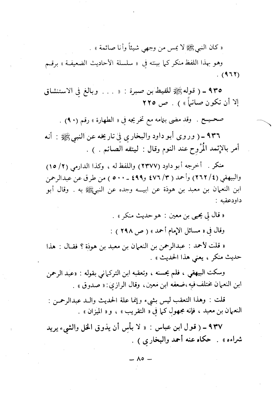 (935) - (قوله صلى الله عليه وسلم للقيط بن صبرة: " ... وبالغ فى الاستنشاق إلا أن تكون صائما " (ص 225) .