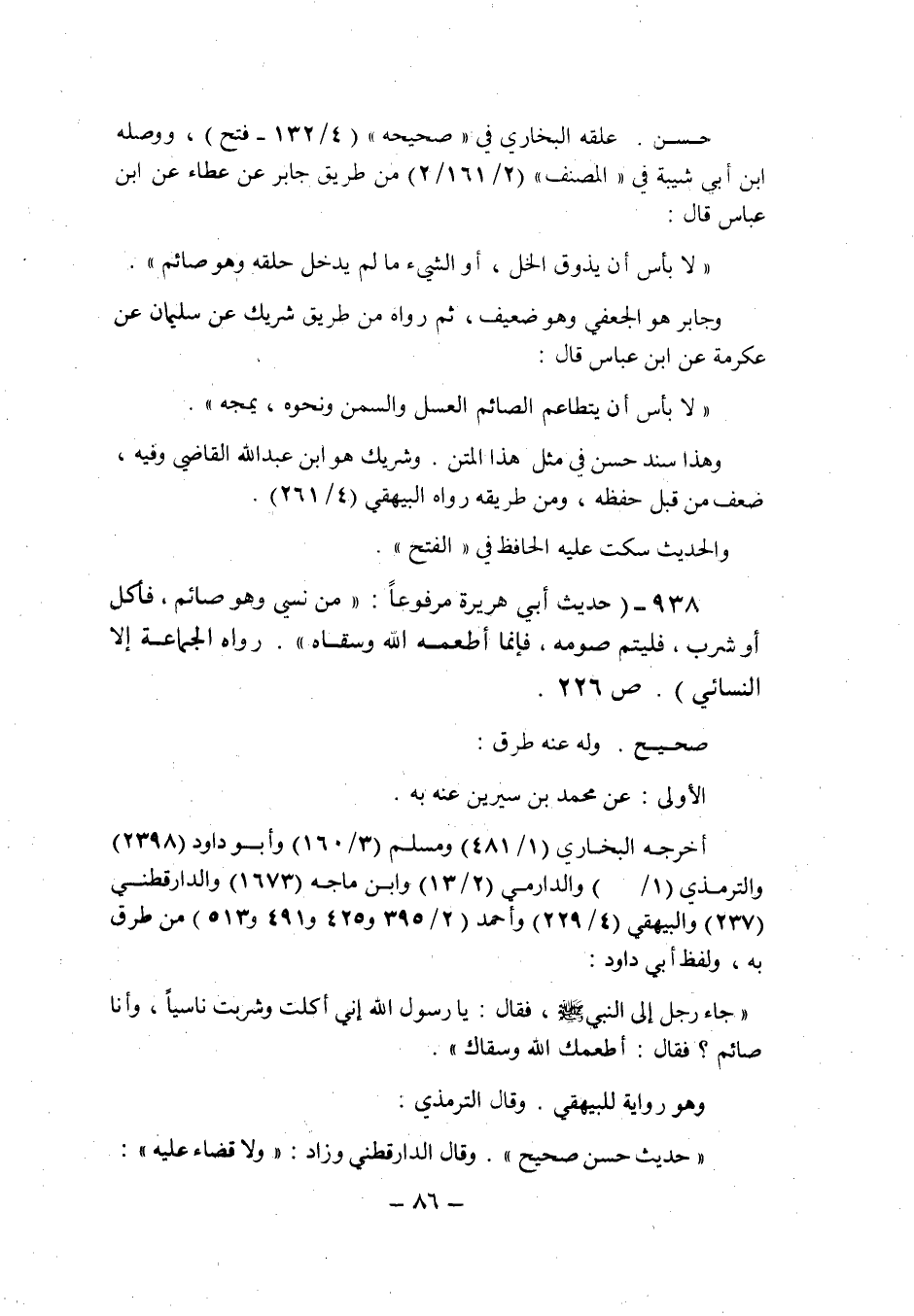 (938) - (حديث أبى هريرة مرفوعا: " من نسى وهو صائم , فأكل أو شرب , فليتم صومه , فإنما أطعمه الله وسقاه " رواه الجماعة إلا النسائى (ص 226) .