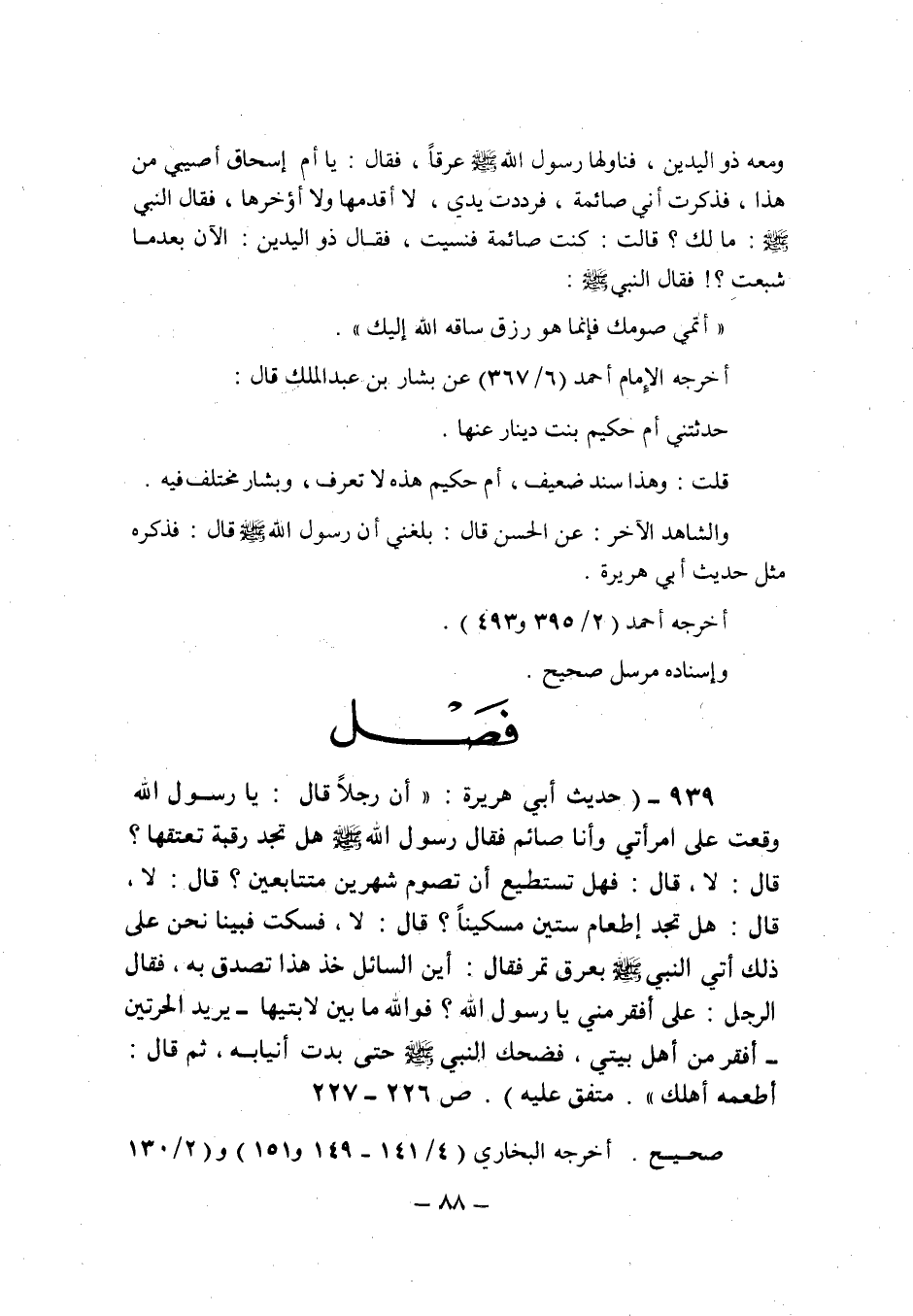 (939) - (حديث أبى هريرة: " أن رجلا قال: يا رسول الله وقعت على امرأتى وأنا صائم فقال رسول الله صلى الله عليه وسلم هل تجد رقبة تعتقها؟ قال: لا , قال: فهل تستطيع أن تصوم شهرين متتابعين؟ قال: لا , قال: هل تجد إطعام ستين مسكينا؟ قال: لا , فسكت فبينما نحن على ذلك أتى النبى صلى الله عليه وسلم بعرق تمر فقال: أين السائل خذ هذا تصدق به , فقال الرجل: على أفقر منى يا رسول الله؟ فو الله ما بين لابتيها ـ يريد الحرتين ـ أفقر من أهل بيتى , فضحك النبى صلى الله عليه وسلم حتى بدت أنيابه , ثم قال: أطعمه أهلك ". متفق عليه (ص 226 ـ 227) .