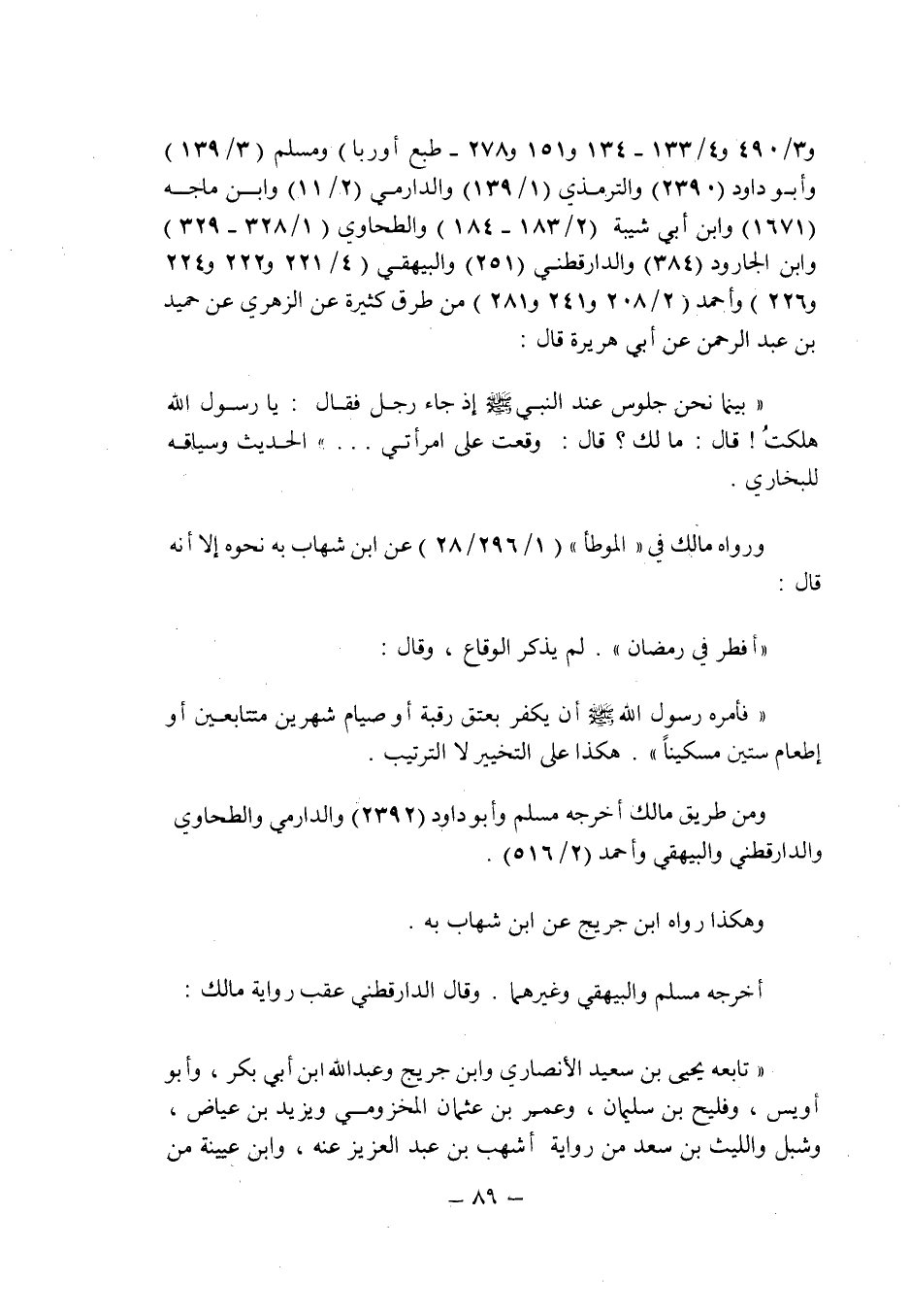 و 3/490 و4/133 ـ 134 و151و 278 ـ طبع أوربا) ومسلم (3/139) وأبو داود (2390) والترمذى (1/139) والدارمى (2/11) وابن ماجه (1671) وابن أبى شيبة (2/183 ـ 184) والطحاوى (1/328 ـ 329) وابن الجارود (384) والدارقطنى (251) والبيهقى (4/221 و222 و224 و226) وأحمد (2/208 و241 و281) من طرق كثيرة عن الزهرى عن حميد بن عبد الرحمن عن أبى هريرة قال: " بينما نحن جلوس عند النبى صلى الله عليه وسلم إذا جاء رجل فقال: يا رسول الله هلكت! قال: ما لك؟ قال: وقعت على امرأتى ... " الحديث وسياقه للبخارى.