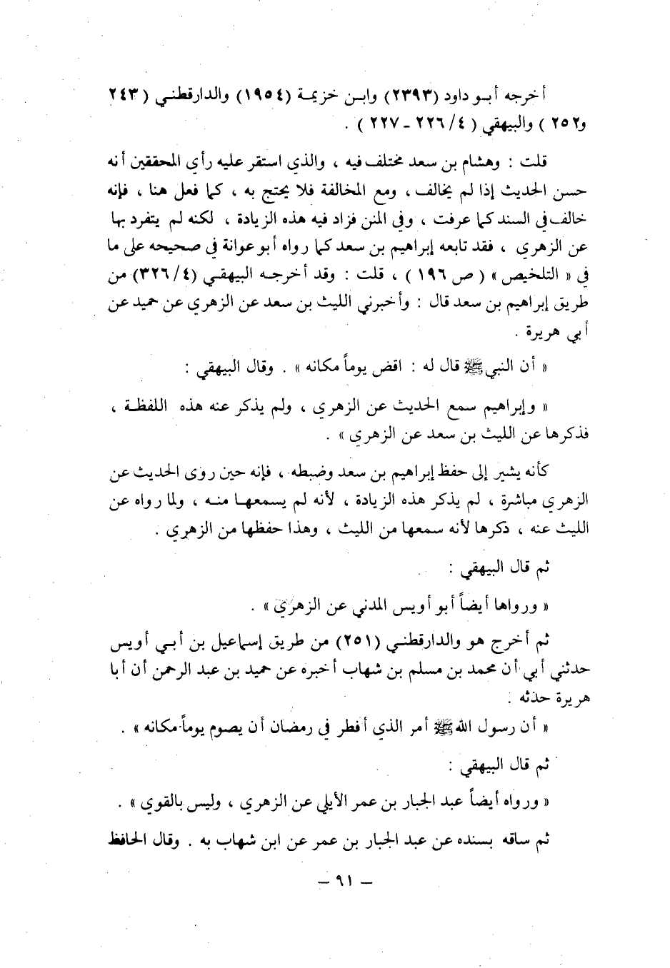 قلت: وهشام بن سعد مختلف فيه , والذى استقر عليه رأى المحققين أنه حسن الحديث إذا لم يخالف , ومع المخالفة فلا يحتج به , كما فعل هنا , فإنه خالف فى السند كما عرفت , وفى المنن [1] فزاد فيه هذه الزيادة , لكنه لم يتفرد بها عن الزهرى , فقد تابعه إبراهيم بن سعد كما رواه أبو عوانة فى صحيحه على ما فى " التلخيص " (ص 196) , قلت: وقد