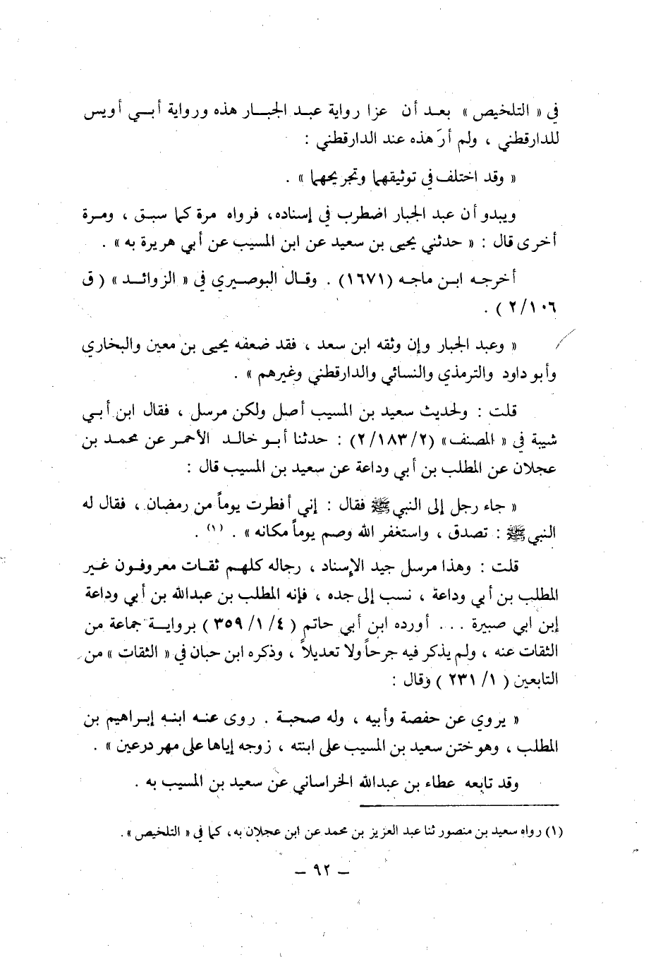 فى " التلخيص " - بعد أن عزا رواية عبد الجبار هذه ورواية أبى أويس للدارقطنى , ولم أرَهذه عند الدارقطنى -: " وقد اختلف فى توثيقهما وتجريحهما ".