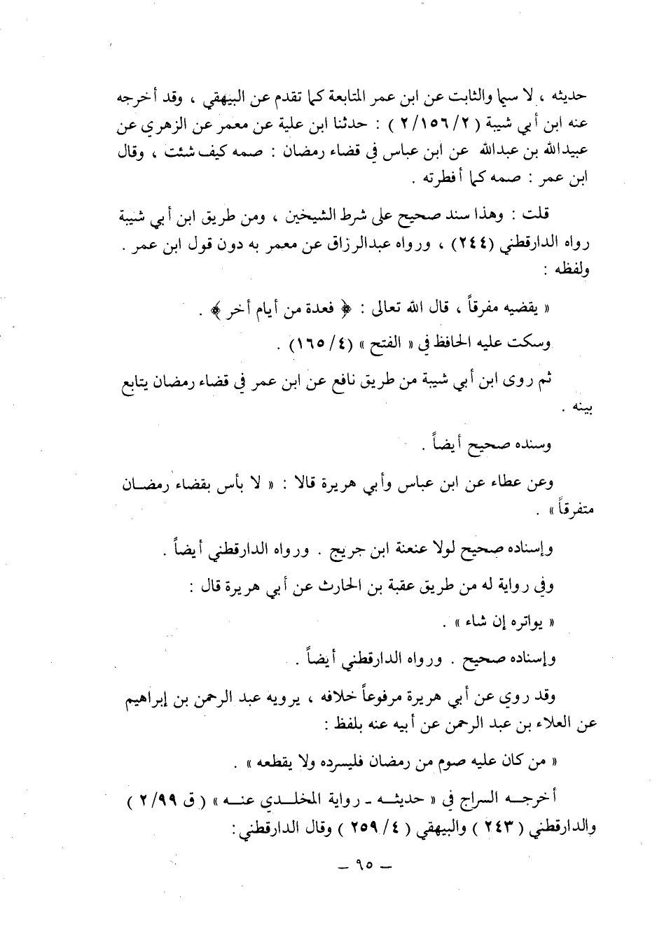 حديثه , لا سيما والثابت عن ابن عمر المتابعة كما تقدم عن البيهقى , وقد أخرجه عنه ابن أبى شيبة (2/156/2) : حدثنا ابن علية عن معمر عن الزهرى عن عبيد الله بن عبد الله عن ابن عباس فى قضاء رمضان: صمه كيف شئت , وقال ابن عمر: صمه كما أفطرته.