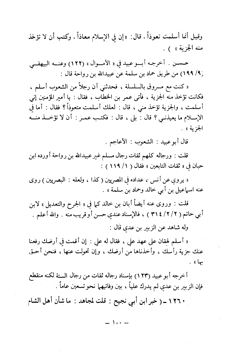 أخرجه أبو عبيد فى " الأموال " (122) وعنه البيهقى (9/199) من طريق حماد ابن سلمة عن عبيد الله بن رواحة قال: " كنت مع مسروق بالسلسلة , فحدثنى أن رجلا من الشعوب أسلم , فكانت تؤخذ منه الجزية , فأتى عمر بن الخطاب , فقال: يا أمير المؤمنين إنى أسلمت , والجزية تؤخذ منى , قال: لعلك أسلمت متعوذا؟ فقال: أما فى الأسلام ما يعيذنى؟ قال: بلى , قال: فكتب عمر: أن لا تؤخذ منه الجزية ".