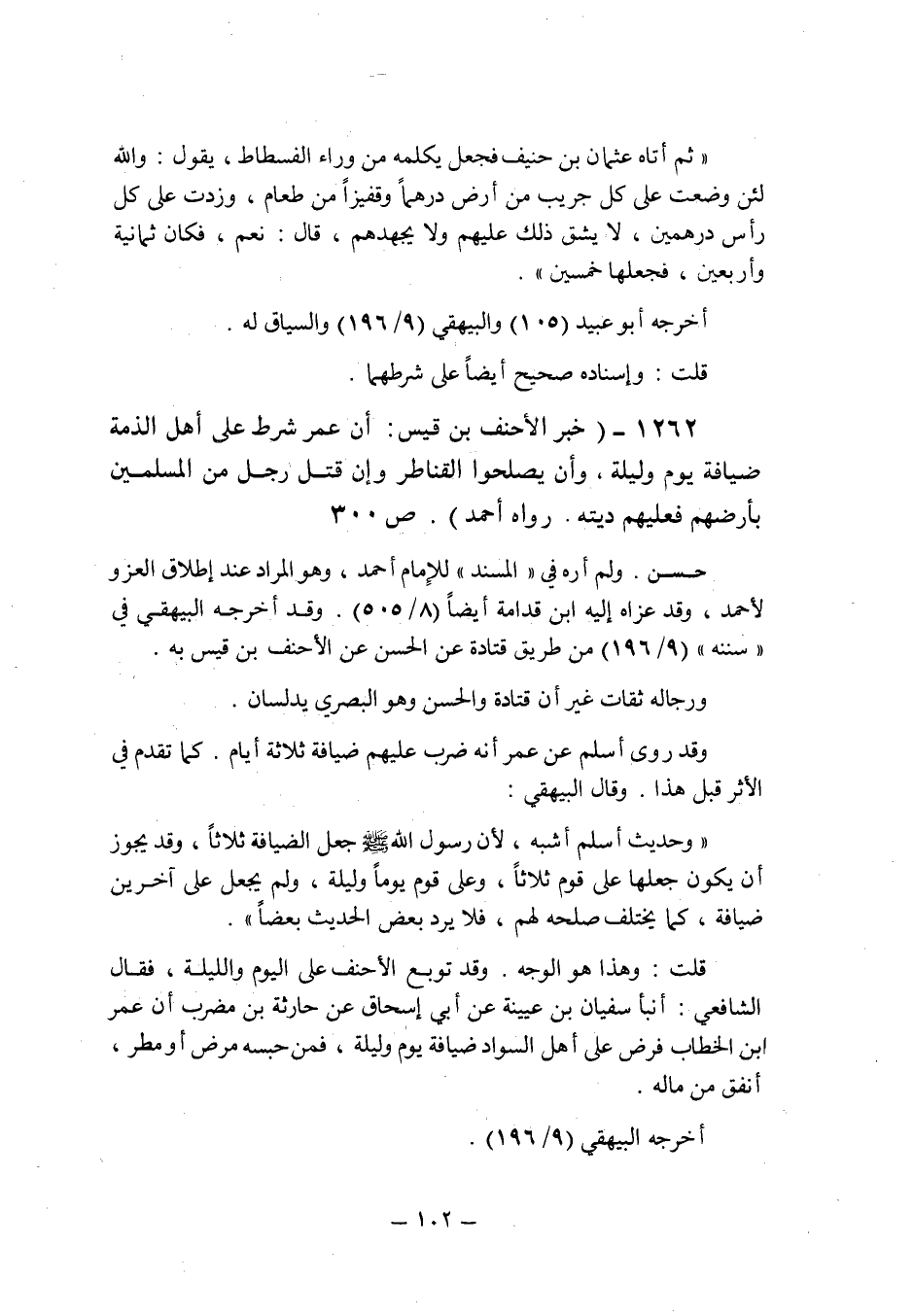 (1262) - (خبر الأحنف بن قيس: " أن عمر شرط على أهل الذمة ضيافة يوم وليلة , وأن يصلحوا القناطر وإن قتل رجل من المسلمين بأرضهم فعليهم ديته " رواه أحمد (ص 300) .