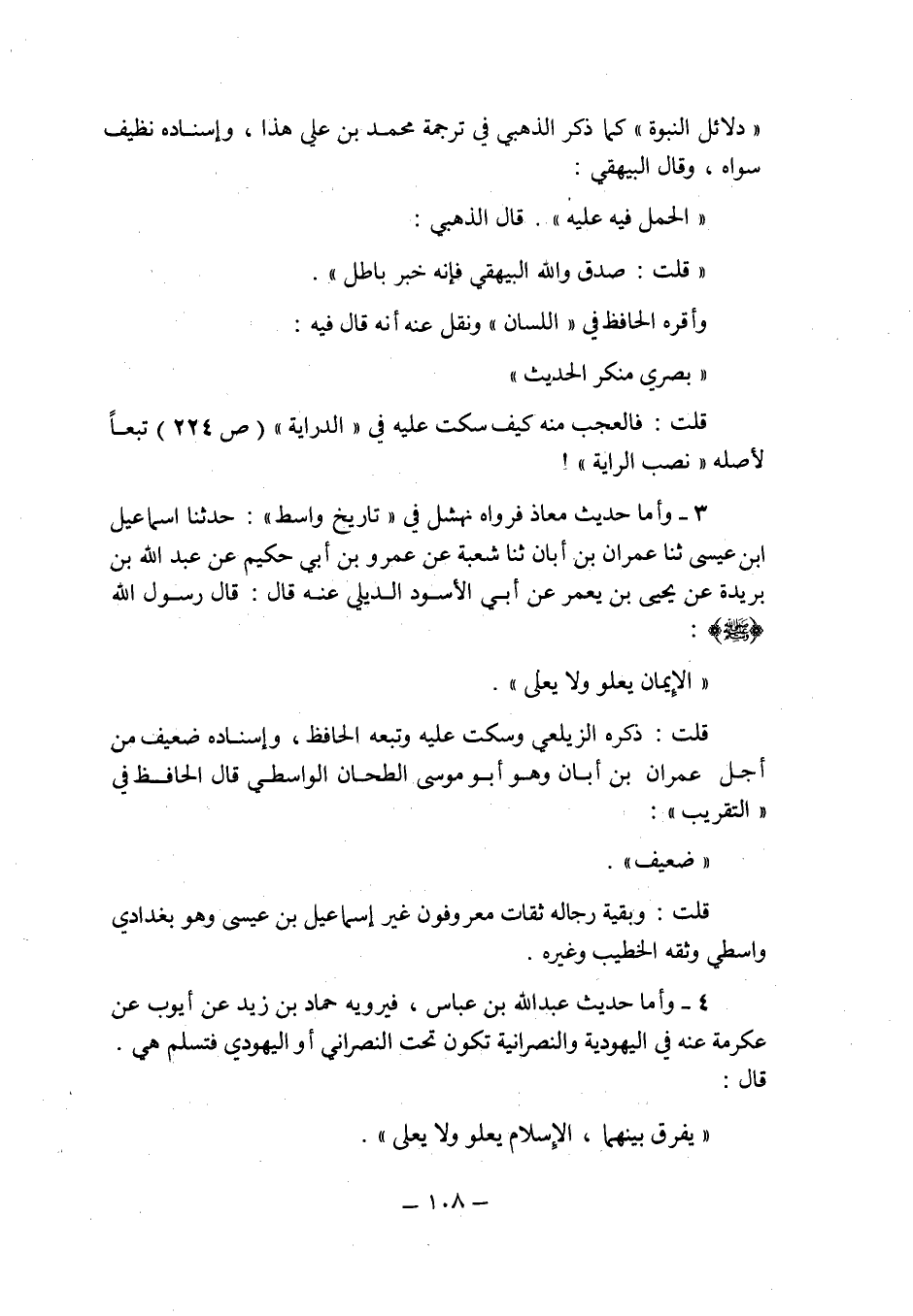 3 ـ وأما حديث معاذ فرواه نهشل فى " تاريخ واسط ": حدثنا إسماعيل بن عيسى حدثنا عمران بن أبان حدثنا شعبة عن عمرو بن أبى حكيم عن عبد الله بن بريدة عن يحيى بن يعمر عن أبى الأسود الديلى عنه قال: قال رسول الله صلى الله عليه وسلم: " الإيمان يعلو ولا يعلى ".