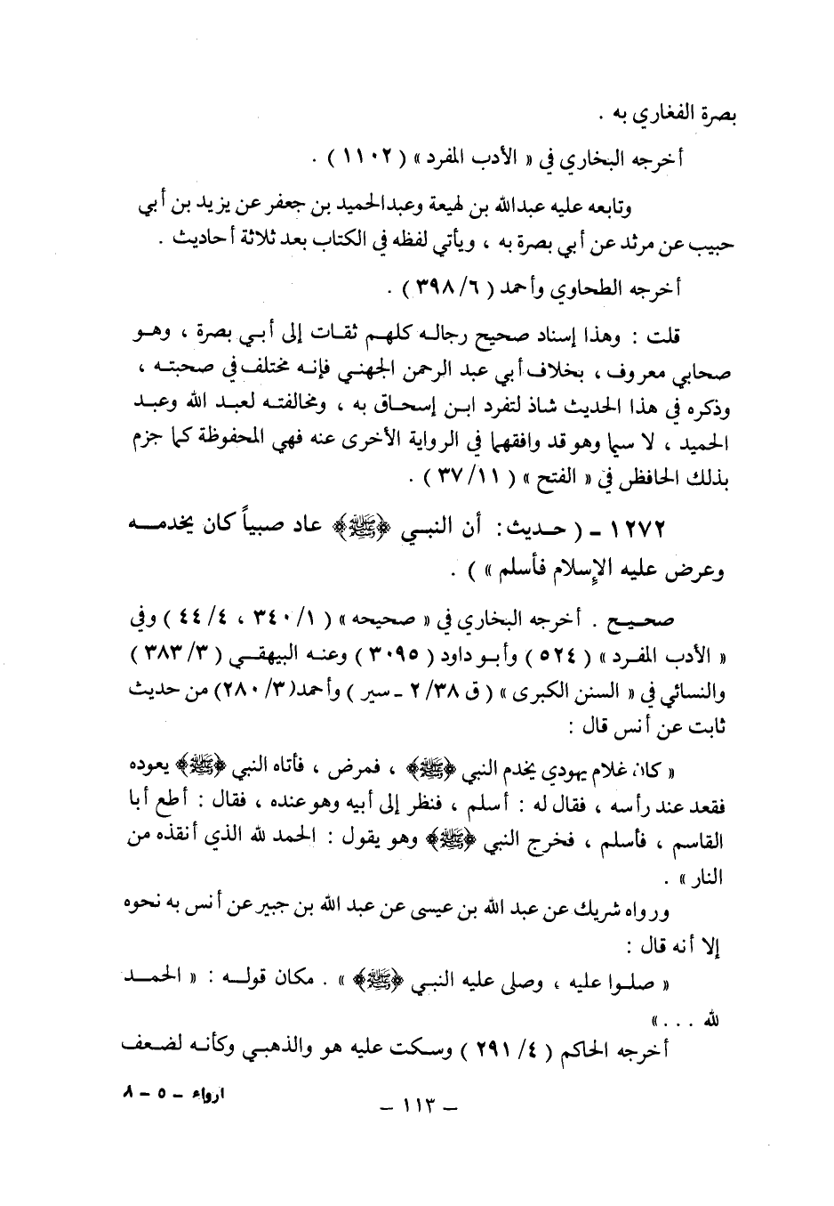 (1272) - (حديث: " أن النبى صلى الله عليه وسلم عاد صبيا كان يخدمه وعرض عليه الإسلام فأسلم ".