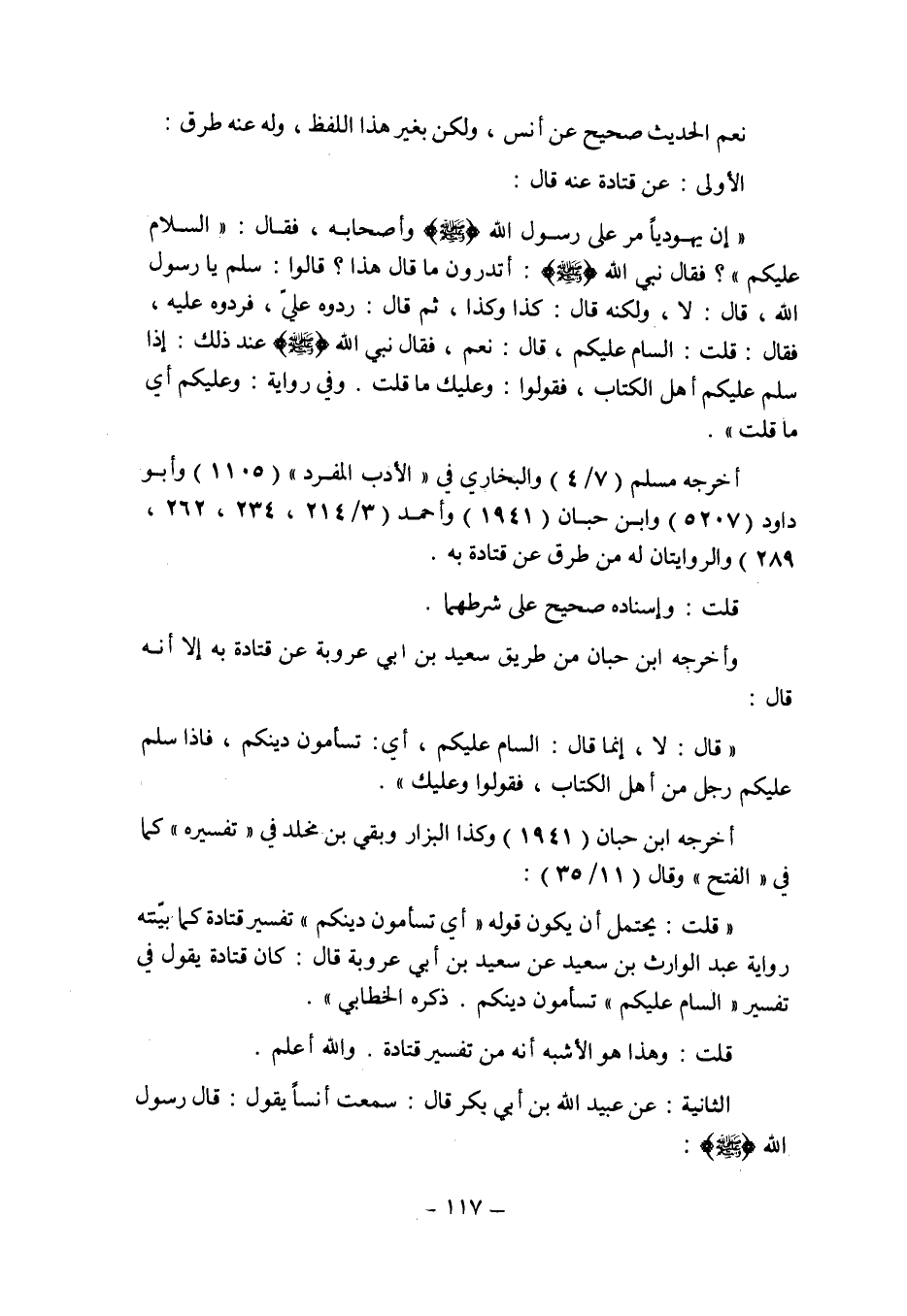 وأخرجه ابن حبان من طريق سعيد بن أبى عروبة عن قتادة به إلا أنه قال: " قال: لا , إنما قال: السام عليكم , أى: تسأمون دينكم , فإذا سلم عليكم رجل من أهل الكتاب , فقولوا وعليك ".