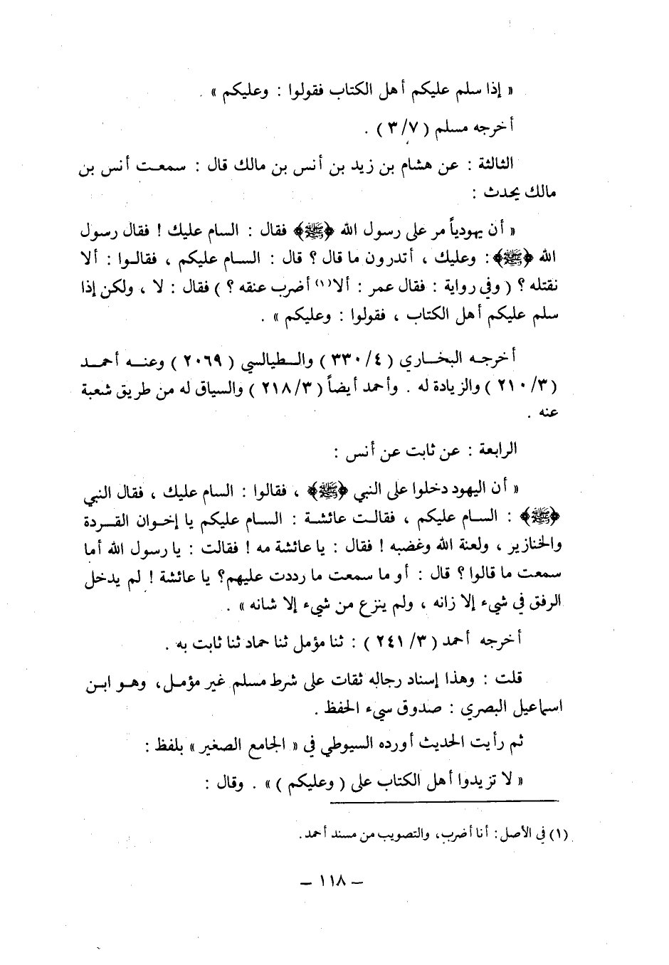 الثالثة: عن هشام بن زيد بن أنس بن مالك قال: سمعت أنسى بن مالك يحدث: " أن يهوديا مر على رسول الله صلى الله عليه وسلم فقال: السام عليك؟ فقال رسول الله صلى الله عليه وسلم: إلا نقتله؟ (وفى رواية: فقال عمر: ألا (1) أضرب عنقه؟) فقال: لا , ولكن إذا سلم عليكم أهل الكتاب , فقولوا: وعليكم ".