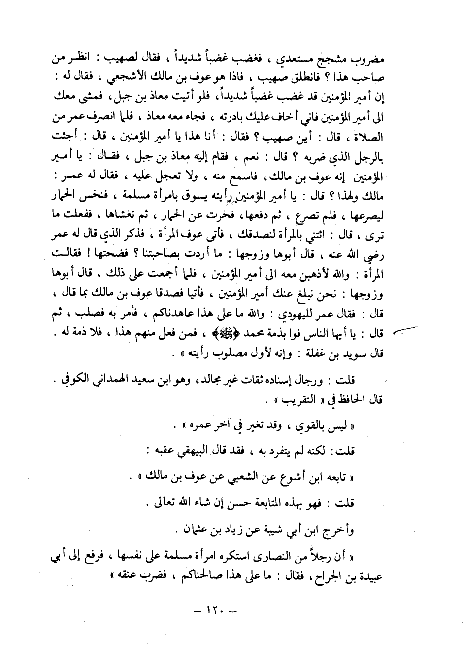 مضروب مشجج مستعدى , فغضب غضبا شديدا , فقال لصهيب: انظر من صاحب هذا؟ فانطلق صهيب , فاذا هو عوف بن مالك الأشجعى , فقال له: إن أمير المؤمنين قد غضب غضبا شديدا , فلو أتيت معاذ بن جبل , فمشى معك إلى أمير المؤنين فإنى أخاف عليك بادرته , فجاء معه معاذ , فلما انصرف عمر من الصلاة , قال: أين صهيب؟ فقال: أنا هذا يا أمير المؤمنين , قال: أجئت بالرجل الذى ضربه؟ قال: نعم , فقام إليه معاذ بن جبل , فقال: يا أمير المؤمنين , إنه عوف بن مالك , فاسمع منه , ولا تعجل عليه , فقال له عمر: مالك ولهذا؟ قال: يا أمير المؤمنين رأيته يسوق بامرأة مسلمة , فنخس الحمار ليصرعها , فلم تصرع , ثم دفعها , فخرت عن الحمار , ثم تغشاها , ففعلت ما ترى , قال: ائتنى بالمرأة لنصدقك , فأتى عوف بالمرأة , فذكر الذى قال له عمر رضى الله عنه , قال أبوها وزوجها: ما أردت بصاحبتنا؟ فضحتها! فقالت المرأة: والله لأذهبن معه إلى أمير المؤمنين , فلما أجمعت على ذلك , قال أبوها وزوجها: نحن نبلغ عنك أمير المؤمنين , فأتيا فصدقا عوف بن مالك بما قال , قال: فقال عمر لليهودى: والله ما على هذا عاهدناكم , فأمر به فصلب , ثم قال: يا أيها الناس فوا بذمة محمد صلى الله عليه وسلم , فمن فعل منهم هذا , فلا ذمة له.