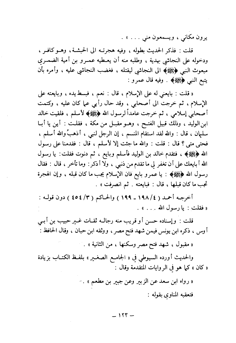 قلت: فذكر الحديث بطوله , وفيه هجرته إلى الحبشة , وهو كافر , ودخوله على النجاشى بهدية , وطلبه منه أن يعطيه عمرو بن أمية الضمرى مبعوث النبى صلى الله عليه وسلم إلى النجاشى ليقتله , فغضب النجاشى عليه , وأمره بأن يتبع النبى صلى الله عليه وسلم , وفيه قال لعمرو: " قلت: بايعنى له على الإسلام , قال: نعم , فبسط يده , وبايعته على الإسلام , ثم خرجت إلى أصحابى , وقد حال رأيى عما كان عليه , وكتمت أصحابى إسلامى , ثم خرجت عامدا لرسول الله صلى الله عليه وسلم لأسلم , فلقيت خالد بن الوليد , وذلك قبيل الفتح , وهو مقبل من مكة , فقلت: أين أبا سليمان , قال: والله لقد استقام المنسم , إن الرجل لنبى , أذهب والله أسلم , فحتى متى؟ قال: قلت: والله ما جئت إلا لأسلم , قال: فقدمنا على رسول الله صلى الله عليه وسلم , فتقدم خالد بن الوليد فأسلم وبايع , ثم دنوت فقلت: يا رسول الله أبايعك على أن تغفر لى ما تقدم من ذنبى , ولا أذكر: وما تأخر , قال: فقال رسول الله صلى الله عليه وسلم: يا عمرو بايع فإن الإسلام يجب ما كان قبله , وإن الهجرة تجب ما كان قبلها , قال: فبايعته.