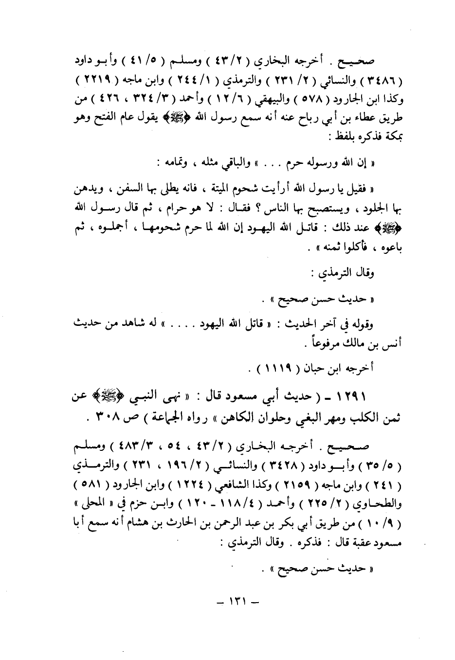 (1291) - (حديث أبي مسعود قال: " نهى النبي صلى الله عليه وسلم عن ثمن الكلب ومهر البغي وحلوان الكاهن " رواه الجماعة) ص 308.