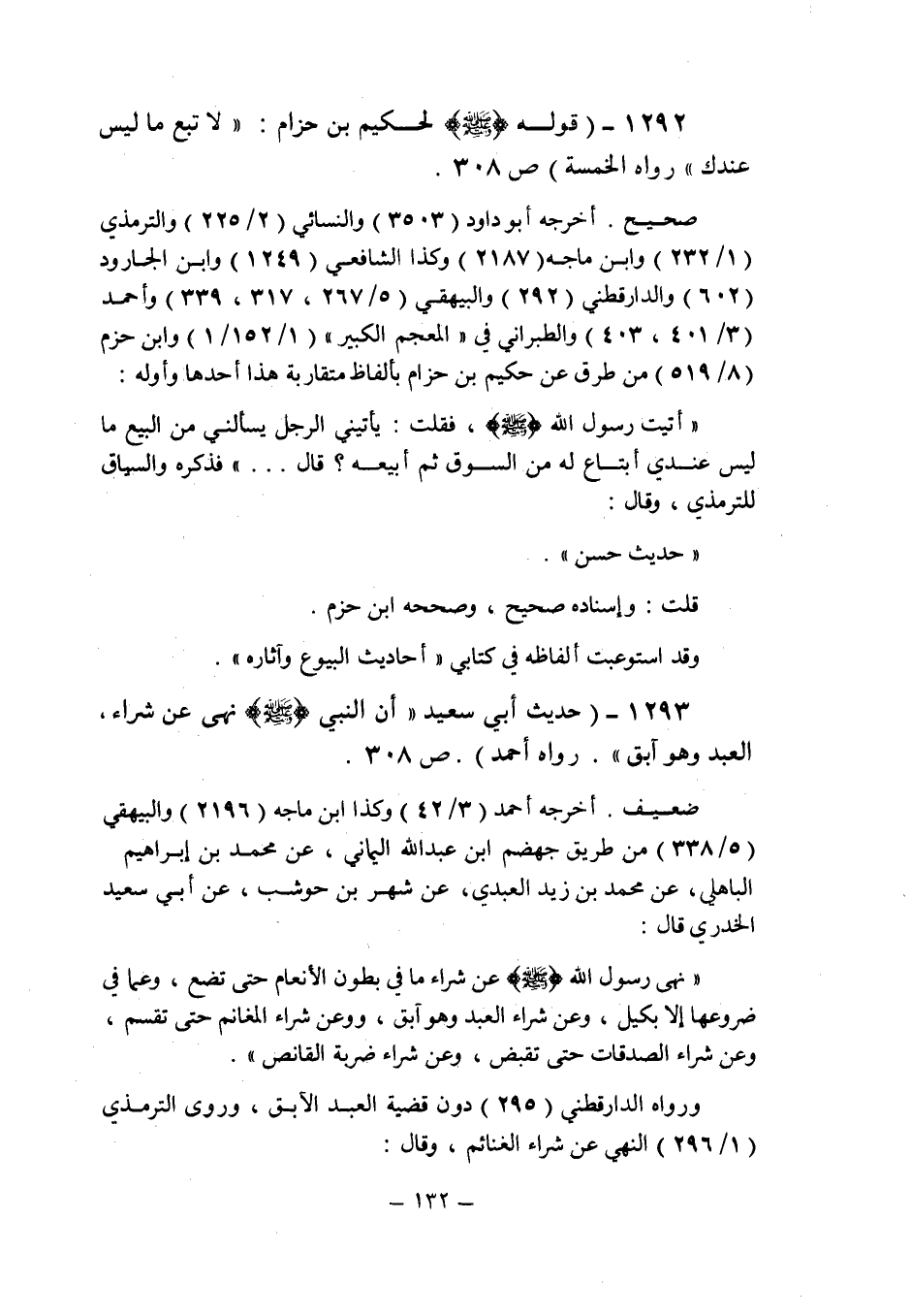 (1292) - (قوله صلى الله عليه وسلم لحكيم بن حزام: " لا تبع ما ليس عندك " رواه الخمسة (ص 308) .