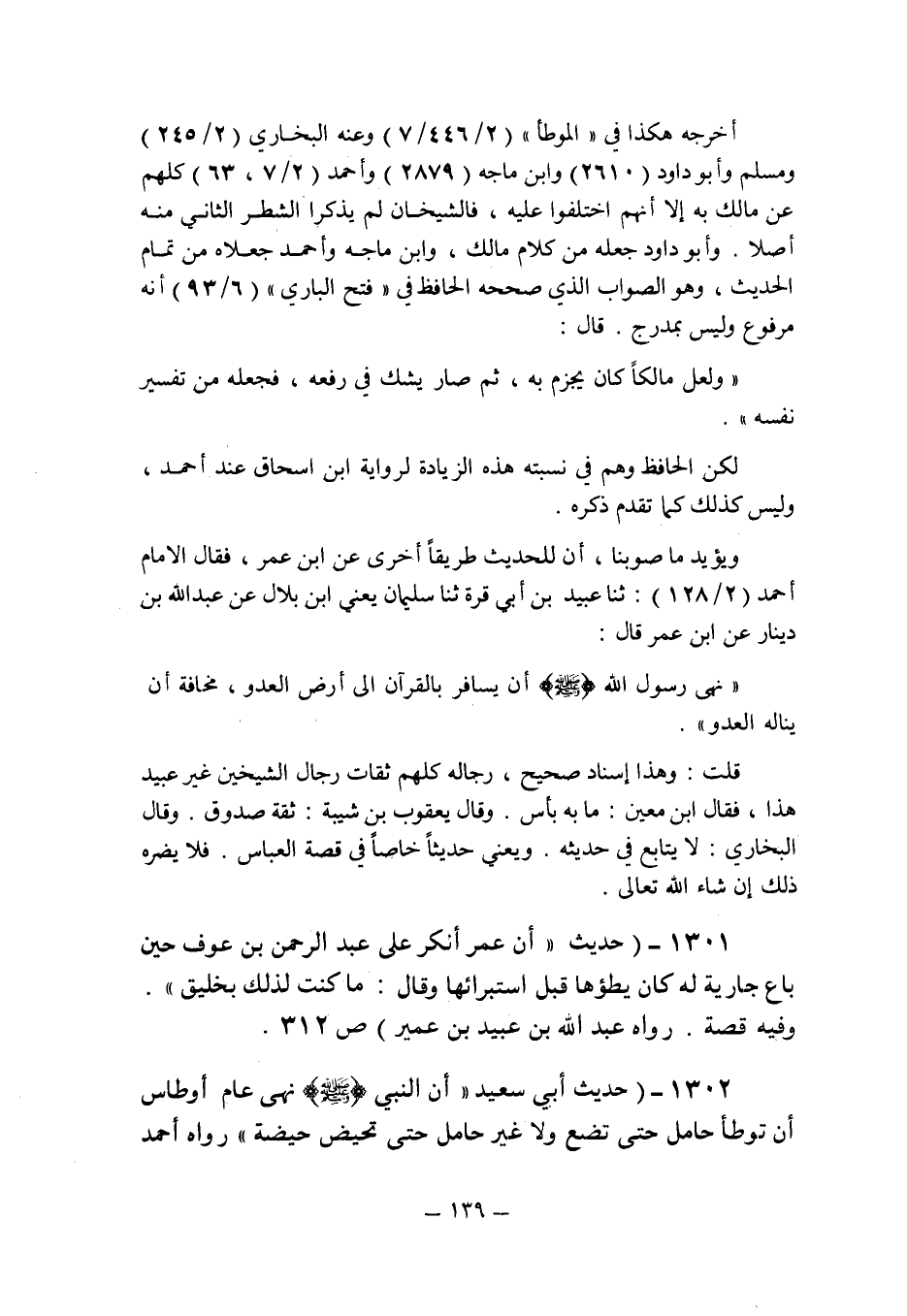 ويؤيد ما صوبنا , أن للحديث طريقا أخرى عن ابن عمر , فقال الإمام أحمد (2/128) : حدثنا عبيد بن أبى قرة حدثنا سليمان يعنى ابن بلال عن عبد الله بن دينار عن ابن عمر قال: " نهى رسول الله صلى الله عليه وسلم أن يسافر بالقرآن إلى أرض العدو , مخافة أن يناله العدو ".