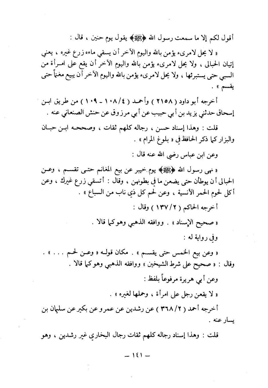 وعن ابن عباس رضى الله عنه قال: " نهى رسول الله صلى الله عليه وسلم يوم خيبر عن بيع المغانم حتى تقسم , وعن الحبالى أن يوطأن حتى يضعن ما فى بطونهن , وقال: أتسقى زرع غيرك , وعن أكل لحوم الحمر الإنسية , وعن لحم كل ذى ناب من السباع ".
