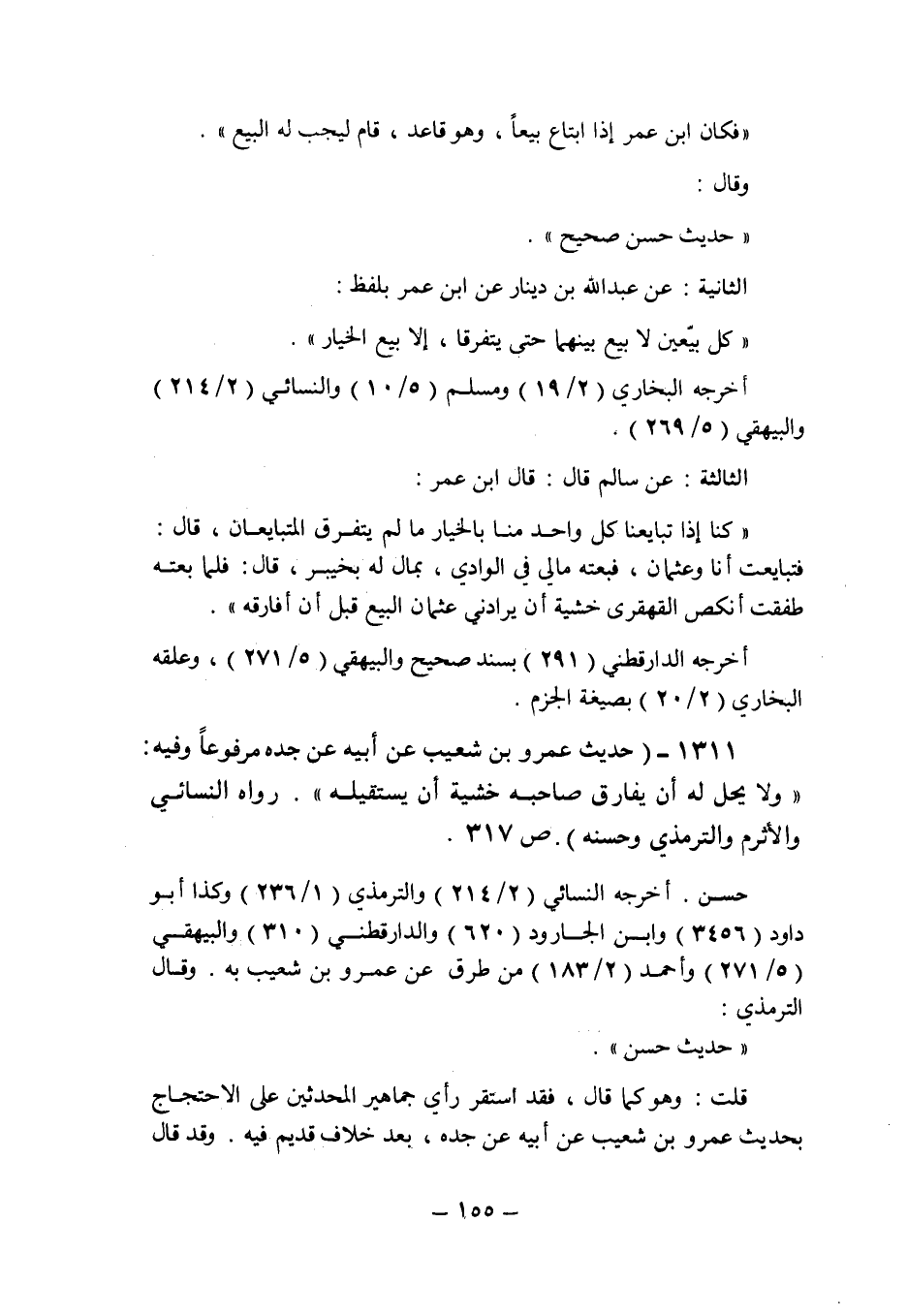 (1311) - (حديث عمرو بن شعيب عن أبيه عن جده مرفعا وفيه: " ولا يحل له أن يفارق صاحبه خشية أن يستقيله " رواه النسائى والأثرم والترمذى وحسنه (ص 317) .
