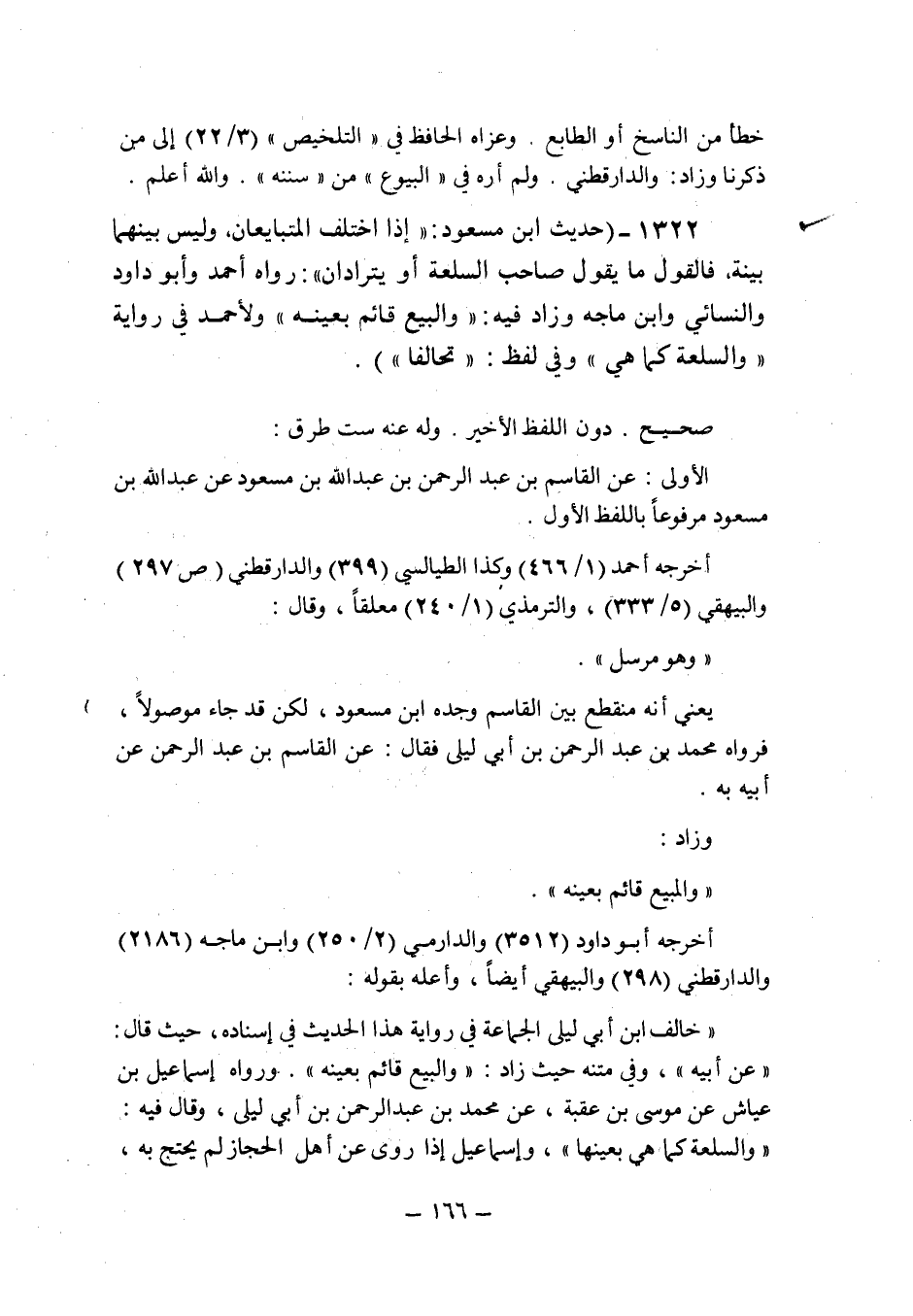 (1322) - (حديث ابن مسعود: " إذا اختلف المتبايعان , وليس بينهما بينة , فالقول ما يقول صاحب السلعة أو يترادان " رواه أحمد وأبو داود والنسائى وابن ماجه وزاد فيه: " والبيع قائم بعينه ". ولأحمد فى رواية: " والسلعة كما هى ". وفى لفظ: " تحالفا ".