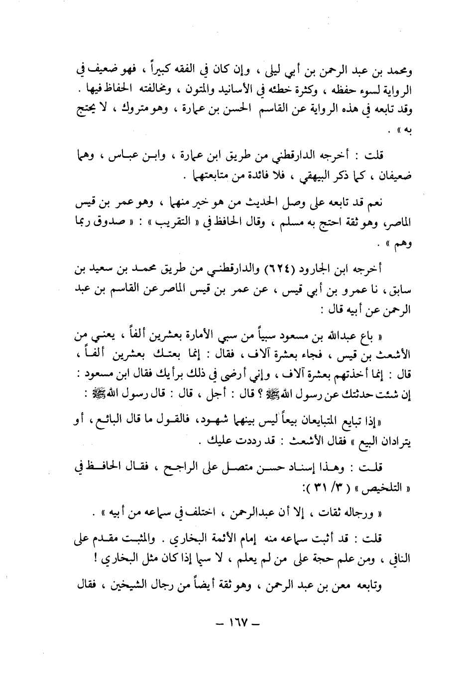 ومحمد بن عبد الرحمن بن أبى ليلى , وإن كان فى الفقه كبيرا , فهو ضعيف فى الرواية لسوء حفظه , وكثرة خطئه فى الأسانيد والمتون , ومخالفته الحفاظ فيها , وقد تابعه فى هذه الرواية عن القاسم الحسن بن عمارة , وهو متروك , لا يحتج به ".