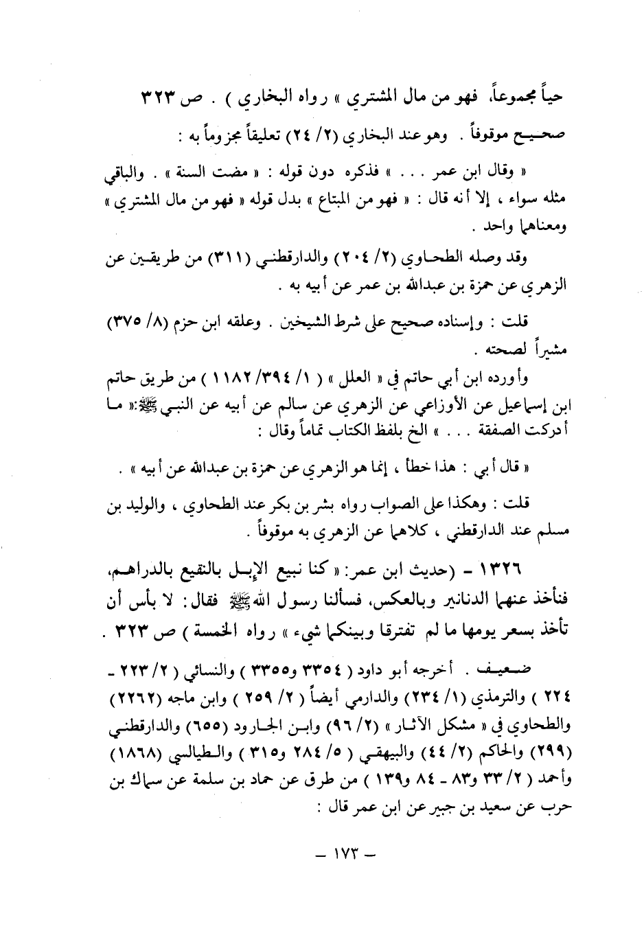 وأورده ابن أبى حاتم فى " العلل " (1/394/1182) من طريق حاتم بن إسماعيل عن الأوزاعى عن الزهرى عن سالم عن أبيه عن النبى صلى الله عليه وسلم: " ما أدركت الصفقة ... " الخ بلفظ الكتاب تماما وقال: " قال أبى: هذا خطأ , إنما هو الزهرى عن حمزة بن عبد الله عن أبيه ".