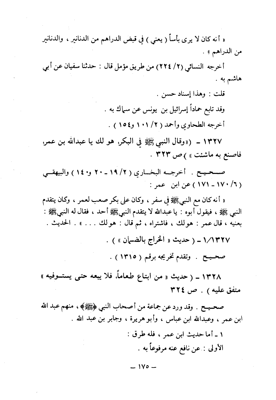 (1328) - (حديث: " من ابتاع طعاما , فلا يبعه حتى يستوفيه " متفق عليه (ص 324) .