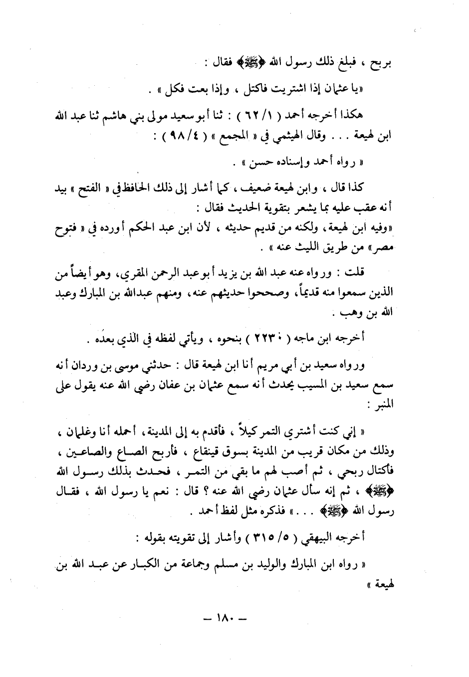 ورواه سعيد بن أبى مريم أنبأنا ابن لهيعة قال: حدثنى موسى بن وردان أنه سمع سعيد بن المسيب يحدث أنه سمع عثمان بن عفان رضى الله عنه يقول على المنبر: " إنى كنت أشترى التمر كيلا , فأقدم به إلى المدينة أحمله أنا وغلمان , وذلك من مكان قريب من المدينة بسوق قينقاع , فأربح الصاع والصاعين , فأكتال ربحى , ثم أصب لهم ما بقى من التمر , فحدث بذلك رسول الله صلى الله عليه وسلم , ثم إنه سأل عثمان رضى الله عنه؟ قال: نعم يا رسول الله , فقال رسول الله صلى الله عليه وسلم ... " فذكره مثل لفظ أحمد.
