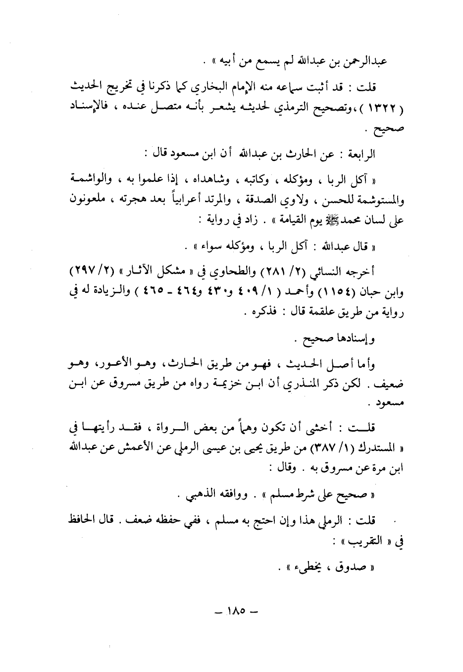 الرابعة: عن الحارث بن عبد الله أن ابن مسعود قال: " آكل الربا , ومؤكله , وكاتبه , وشاهداه , إذا علموا به , والواشمة والمستوشمة للحسن , ولاوى الصدقة , والمرتد أعرابيا بعد هجرته , ملعونون على لسان محمد صلى الله عليه وسلم يوم القيامة ".