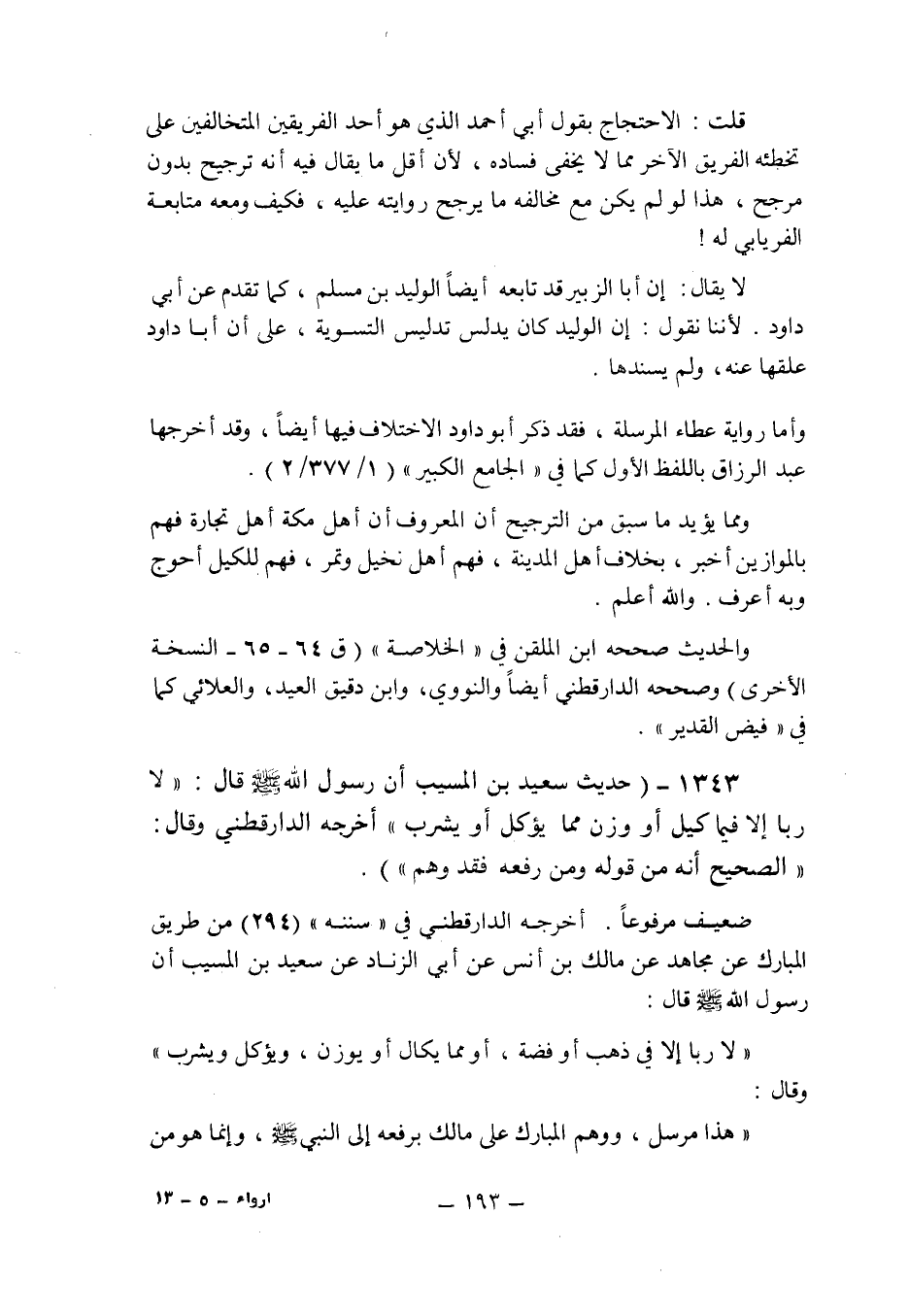 (1343) - (حديث سعيد بن المسيب أن رسول الله صلى الله عليه وسلم قال: " لا ربا إلا فيما كيل أو وزن مما يؤكل أو يشرب " أخرجه الدارقطنى وقال: " الصحيح أنه من قوله ومن رفعه فقد وهم ".