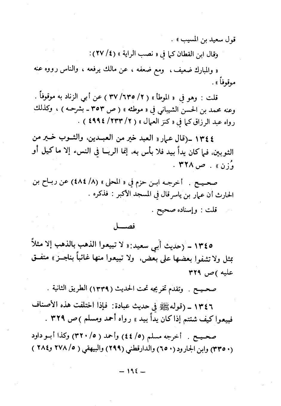 (1345) - (حديث أبى سعيد: " لا تبيعوا الذهب بالذهب إلا مثلا بمثل ولا تشفوا بعضعها على بعض , ولا تبيعوا منها غائبا بناجز " متفق عليه (ص 329) .
