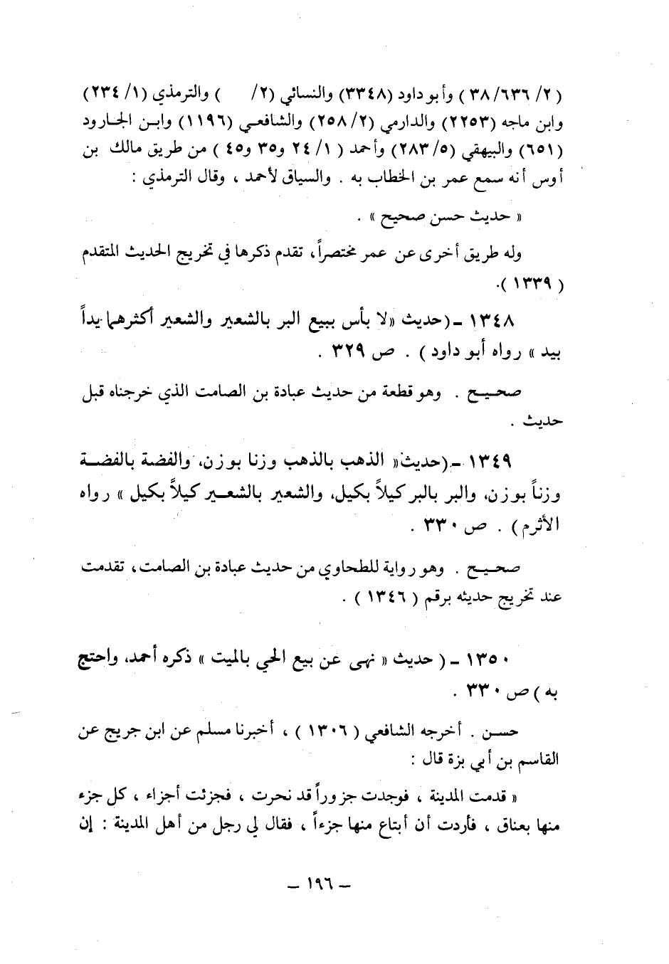 (1349) - (حديث: " الذهب بالذهب وزنا بوزن , والفضة بالفضة وزنا بوزن , والبر بالبر كيلا بكيل , والشعير بالشعير كيلا بكيل " رواه الأثرم (ص 330) .