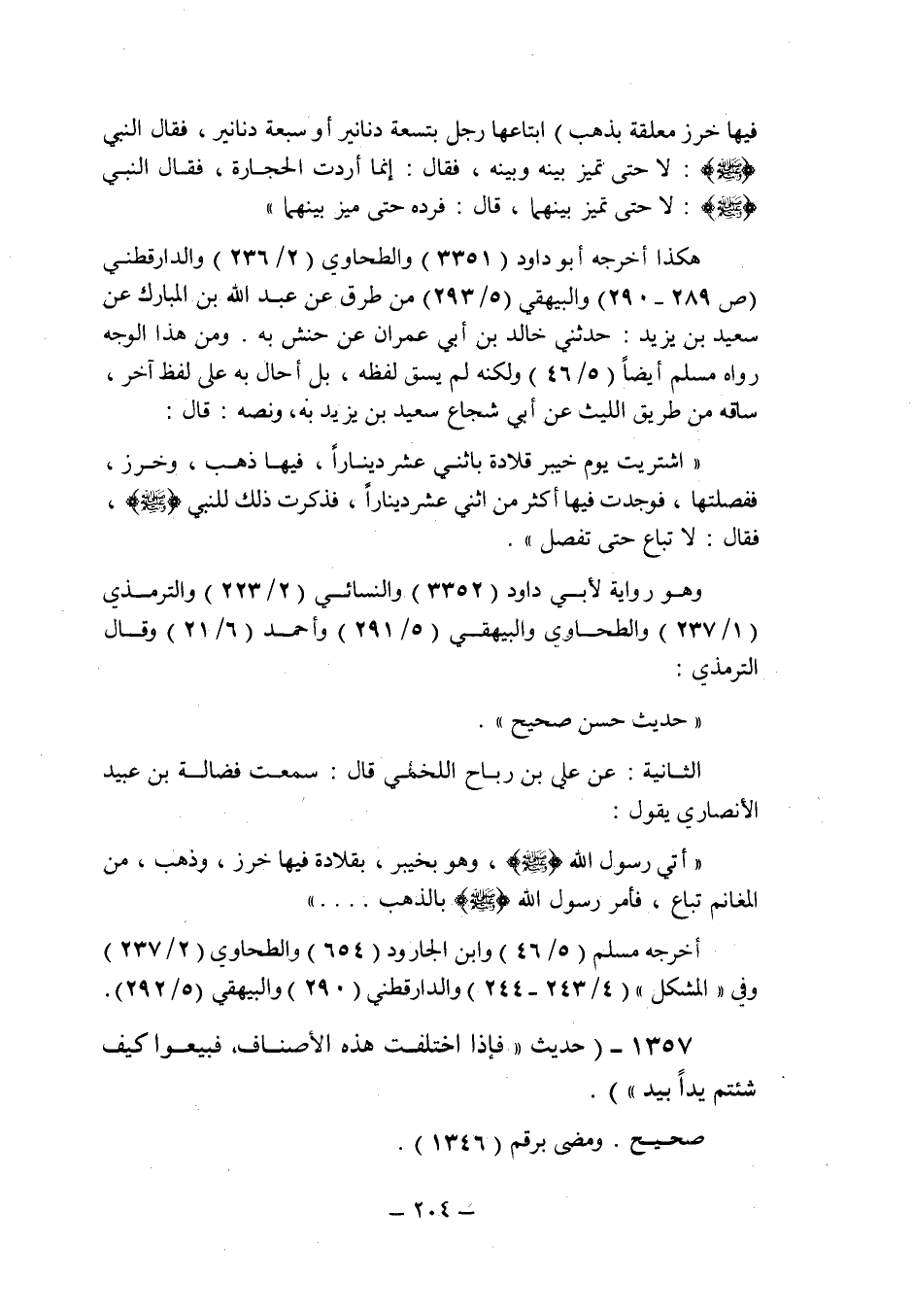 فيها خرز معلقة بذهب) ابتاعها رجل بتسعة دنانير أو سبعة دنانير , فقال النبى صلى الله عليه وسلم: لا حتى تميز بينه وبينه , فقال: إنما أردت الحجارة , فقال النبى صلى الله عليه وسلم: لا حتى تميز بينهما , قال: فرده حتى ميز بينهما ".
