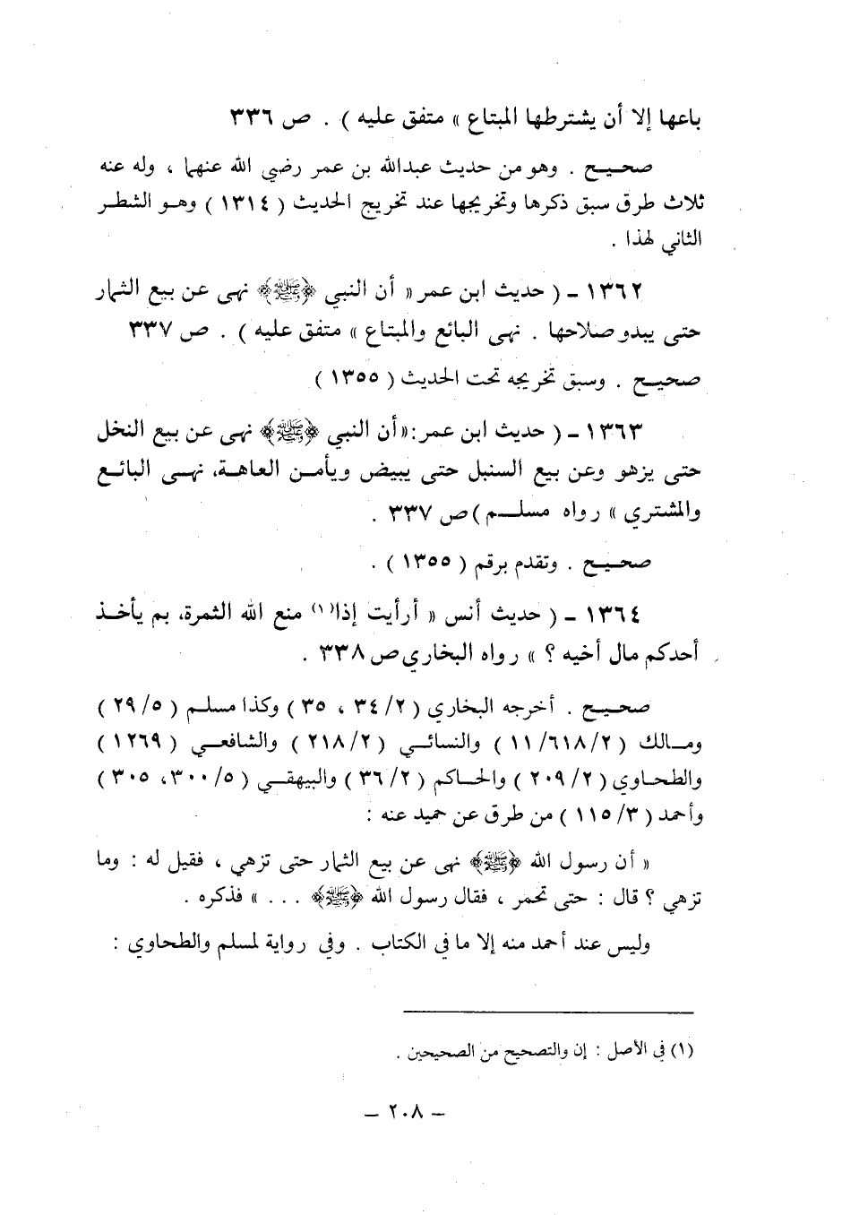 (1363) - (حديث ابن عمر: " أن النبى صلى الله عليه وسلم نهى عن بيع النخل حتى يزهو وعن بيع السنبل حتى يبيض ويأمن العاهة , نهى البائع والمشترى " رواه مسلم (ص 337) .