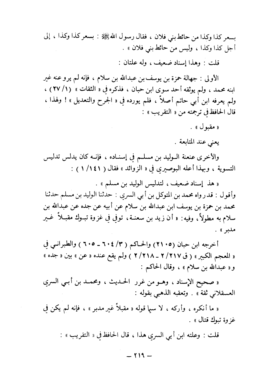 وأقول: قد رواه محمد بن المتوكل بن أبى السرى: حدثنا الوليد بن مسلم حدثنا محمد بن حمزة بن يوسف بن عبد الله بن سلام عن أبيه عن جده عن عبد الله بن سلام به مطولا , وفيه: " أن زيد بن سعنة , توفى فى غزوة تبوك مقبلا غير مدبر ".