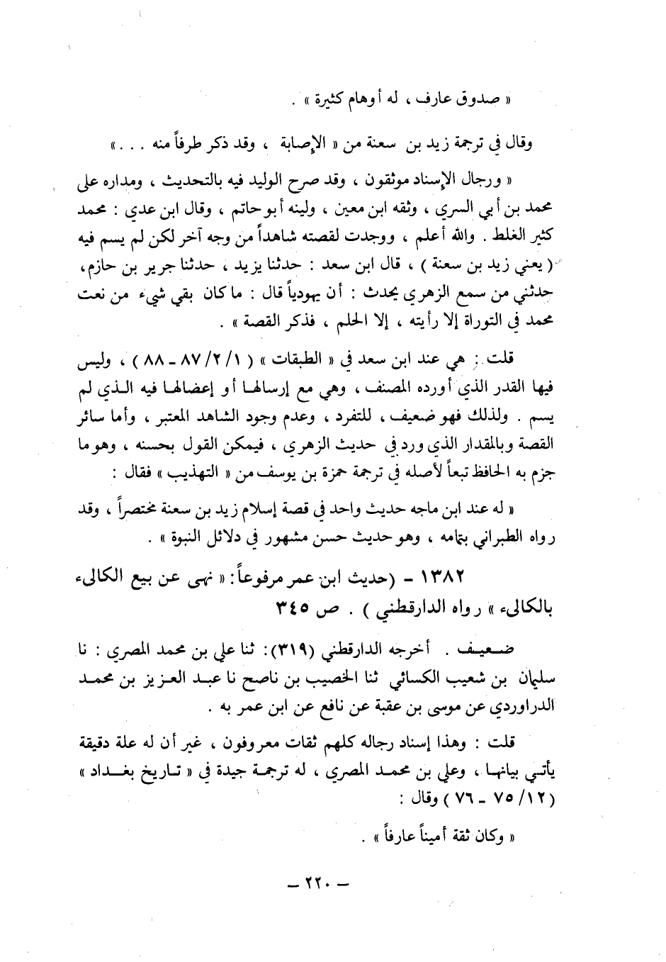 ولذلك فهو ضعيف , للتفرد , وعدم وجود الشاهد المعتبر , وأما سائر القصة وبالمقدار الذى ورد فى حديث الزهرى , فيمكن القول بحسنه , وهو ما جزم به الحافظ تبعا لأصله فى ترجمة حمزة بن يوسف من " التهذيب " فقال: " له عند ابن ماجه حديث واحد فى قصة إسلام زيد بن سعنة مختصرا , وقد رواه الطبرانى بتمامه , وهو حديث حسن مشهور فى دلائل النبوة ".