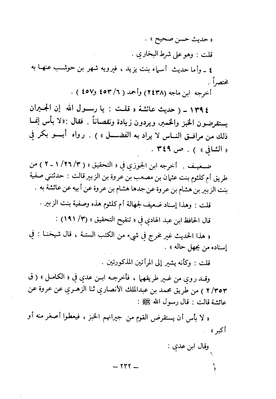 (1394) - (حديث عائشة: " قلت: يا رسول الله إن الجيران يستقرضون الخبز والخمير ويردون زيادة ونقصانا. فقال: " لا بأس إنما ذلك من مرافق الناس لا يراد به الفضل " رواه أبو بكر فى " الشافى " (ص 349) .