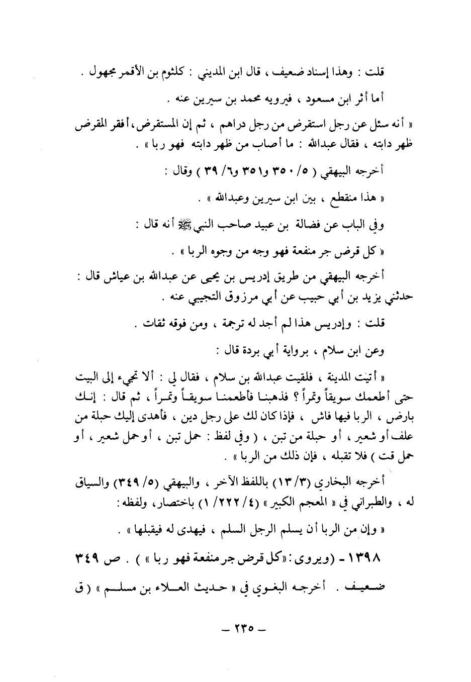 (1398) - (ويروى: " كل قرض جر منفعة فهو ربا " (ص 349) .