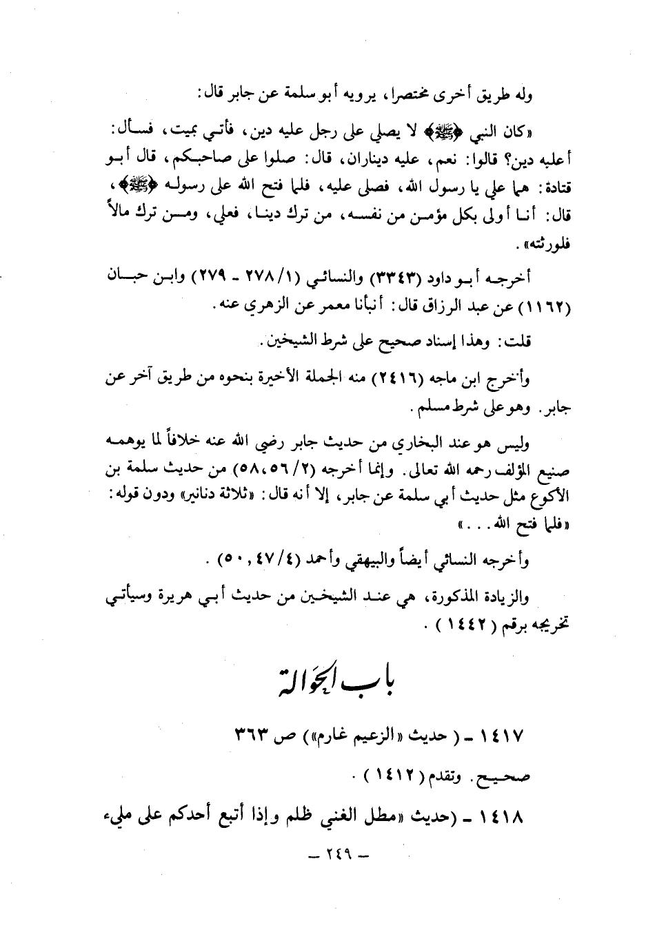 وله طريق أخرى مختصرا , يرويه أبو سلمة عن جابر قال: " كان النبى صلى الله عليه وسلم لا يصلى على رجل عليه دين , فأتى بميت , فسأل: أعليه دين؟ قالوا: نعم , عليه ديناران , قال: صلوا على صاحبكم , قال أبو قتادة: هما على يا رسول الله , فصلى عليه , فلما فتح الله على رسول الله صلى الله عليه وسلم , قال: أنا أولى بكل مؤمن من نفسه , من ترك دينا , فعلى , ومن ترك مالا فلورثته ".